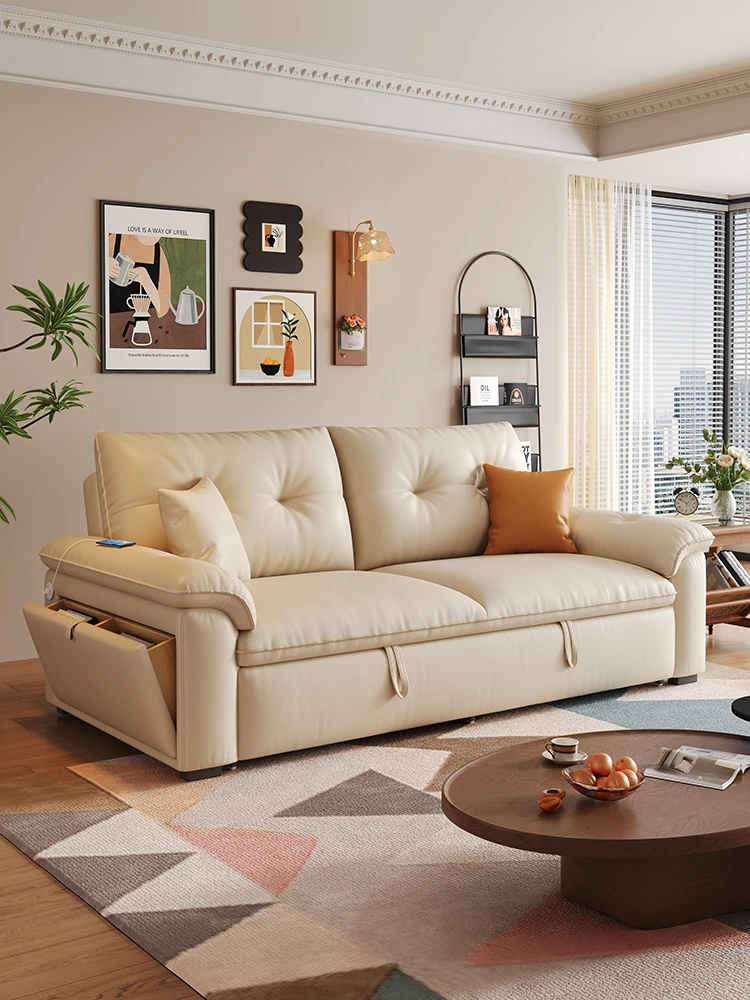 クリーミーな風合いのソファベッド!多機能折りたたみ式、一体型で小型住宅やリビング・書斎に最適なシェニール本革製ソファベッド。快適な眠りとおしゃれな空間を実現!