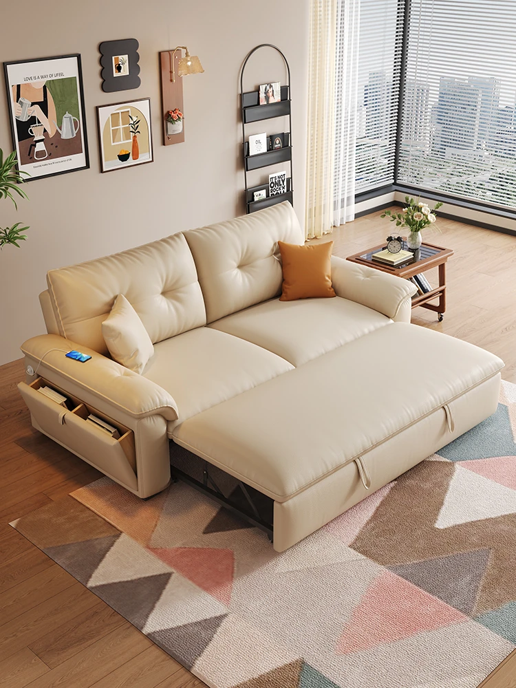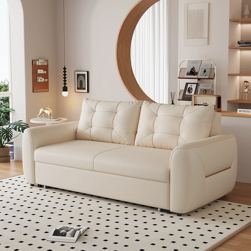 クリーム風猫抓布ソファベッド - 小型住宅に最適!ナパ本革使用の多機能折りたたみ式、2025年新作。快適なリビング空間を演出し、スタイリッシュさをプラス!