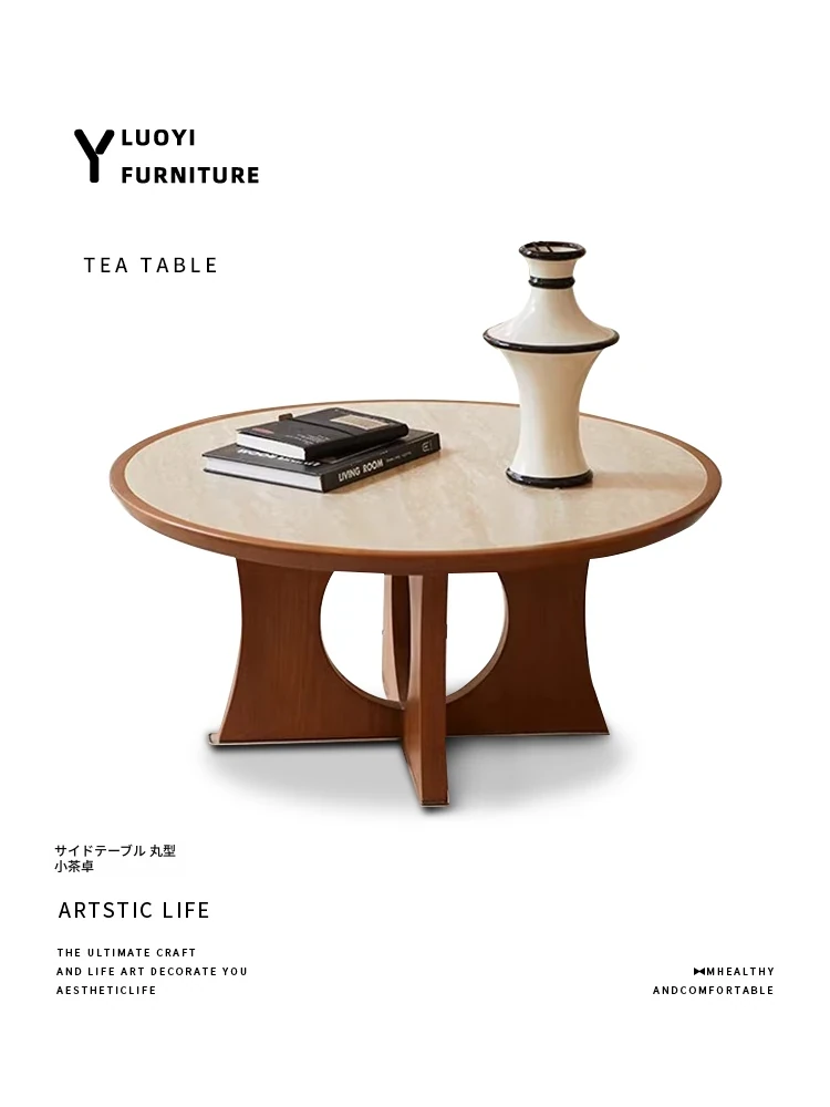 フランス風レトロ無垢材のコーヒーテーブル - 洞石岩板仕様、コンパクトな小型ソファ用サイドテーブル、ユニークな丸型デザインでおしゃれな空間を演出!