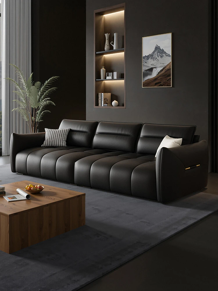 Minimalist Italian Style Genuine Leather Sofa - Black Tofu Block Design, Perfect for Spacious Living Rooms and Luxury Villas