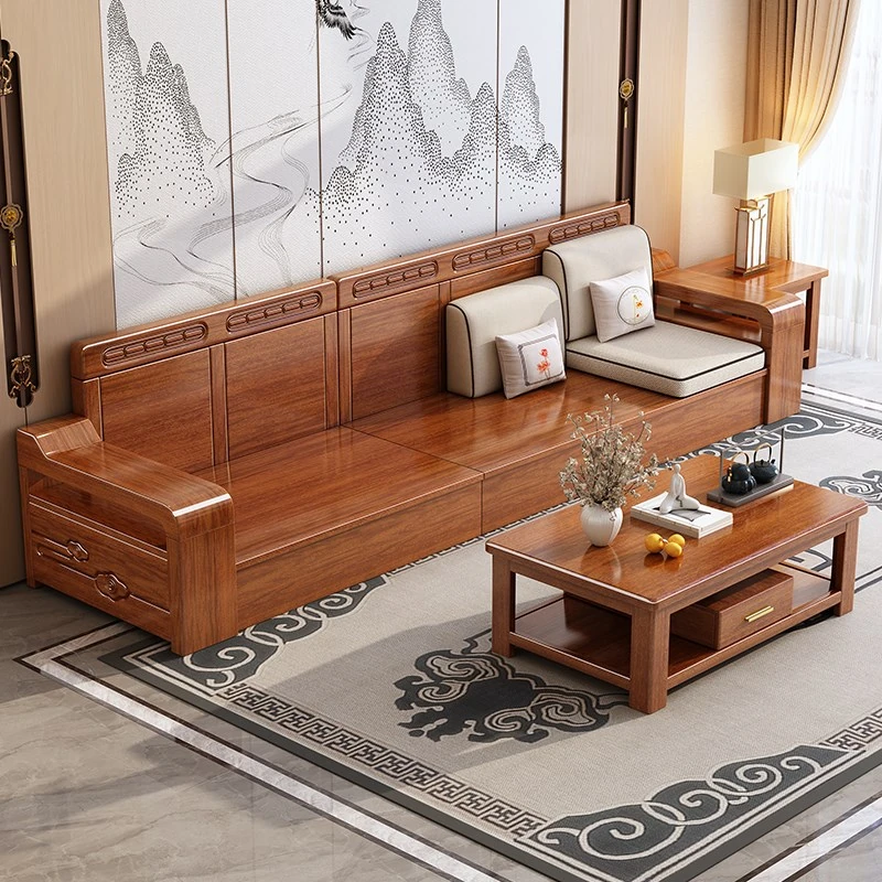 Walnut Solid Wood Sofa for Living Room - Modern New Chinese Style, Full Solid Wood, Compact Design for Small Spaces, Available in 3-Seater and 4-Seater Options