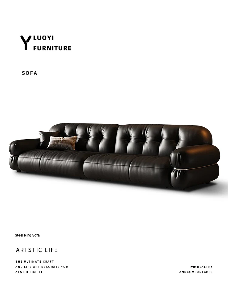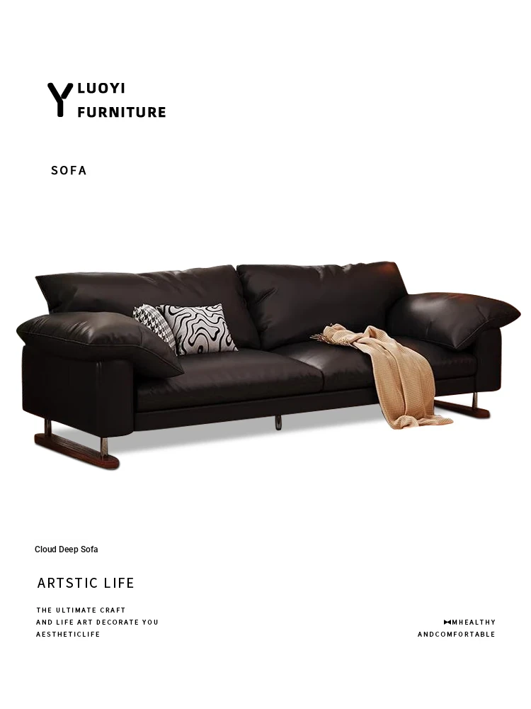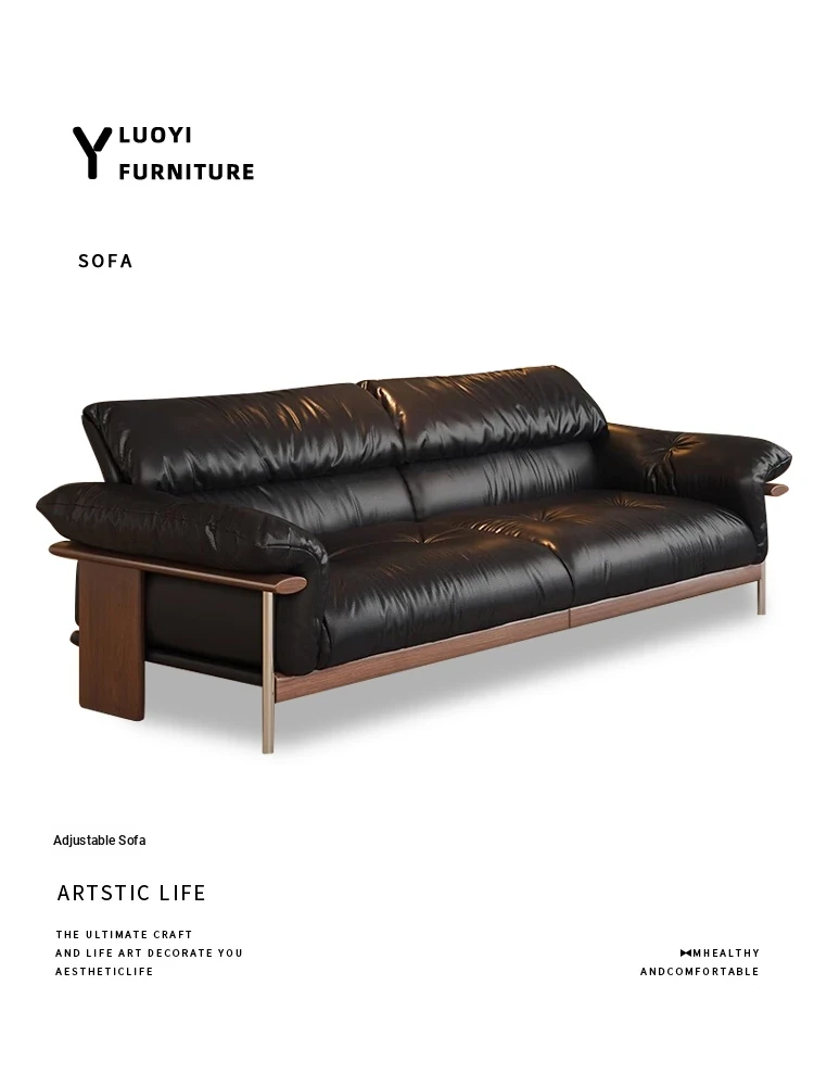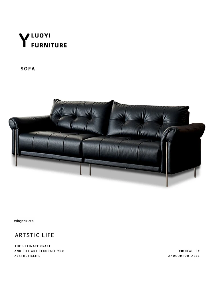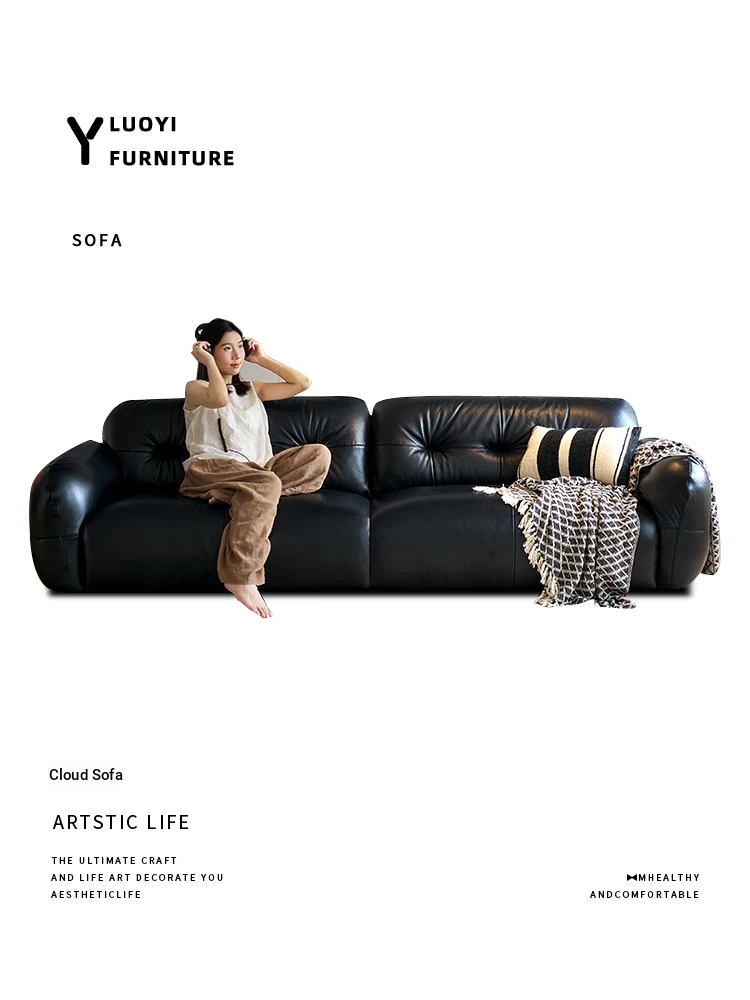 Black Sugar Real Leather Sofa - Italian Minimalist Vintage Style, Black Top Layer Cowhide Designer Cloud-Style Couch for Your Living Room