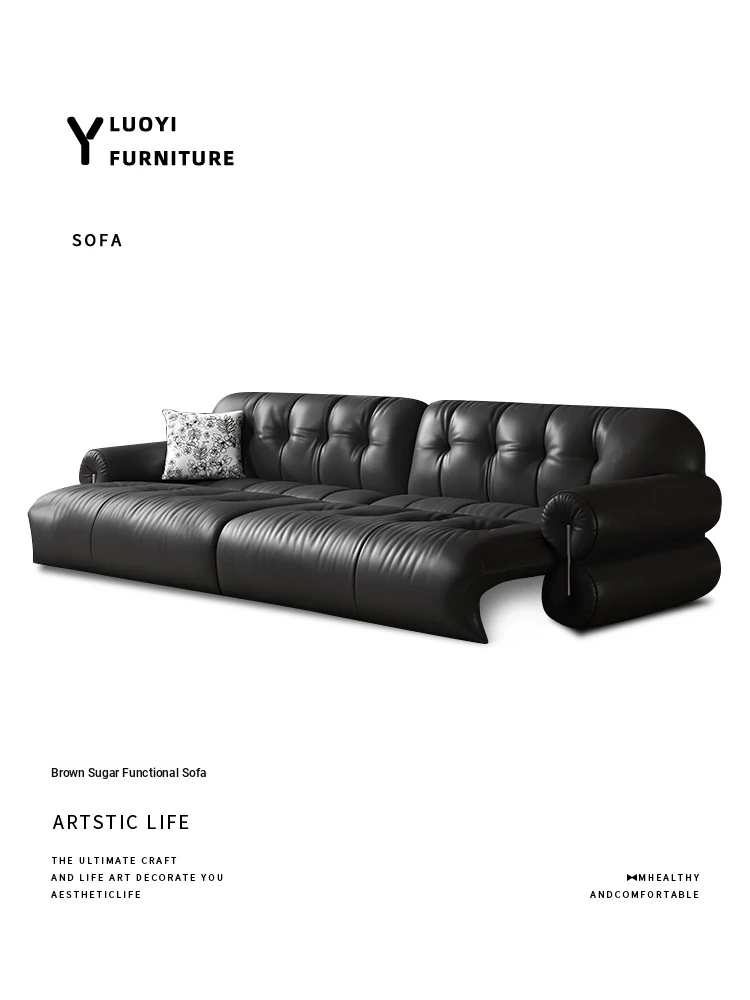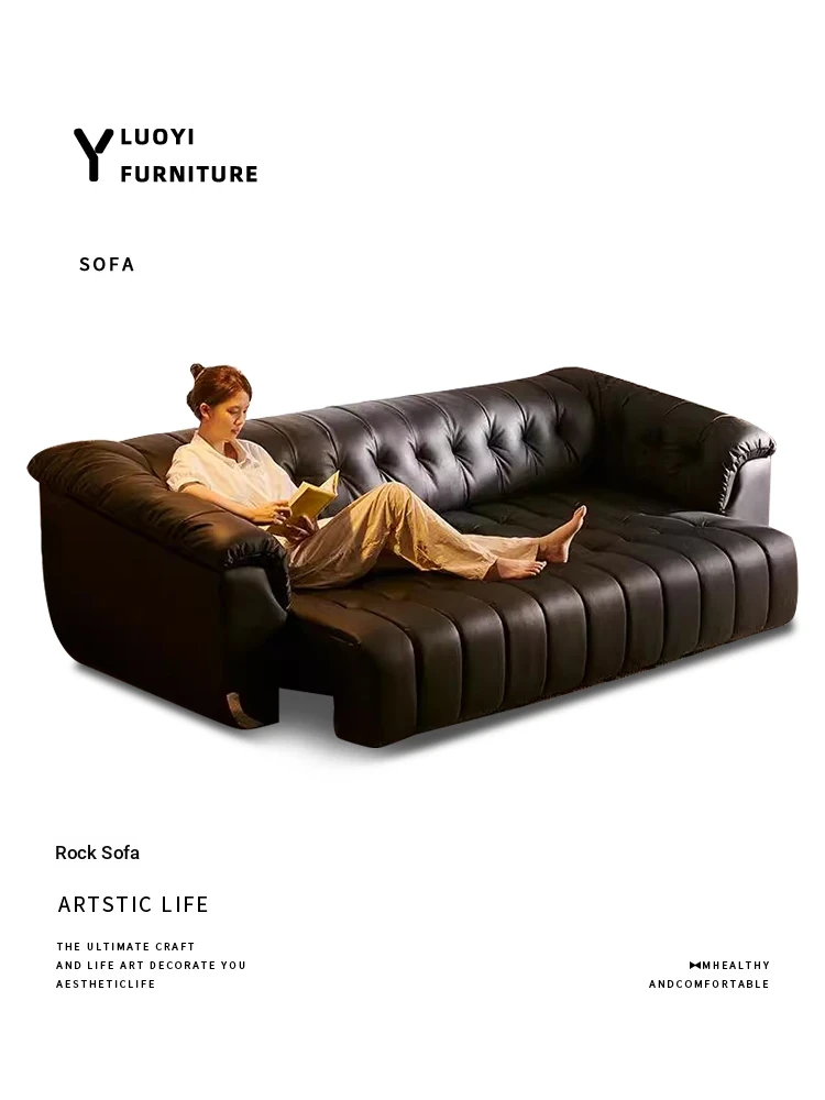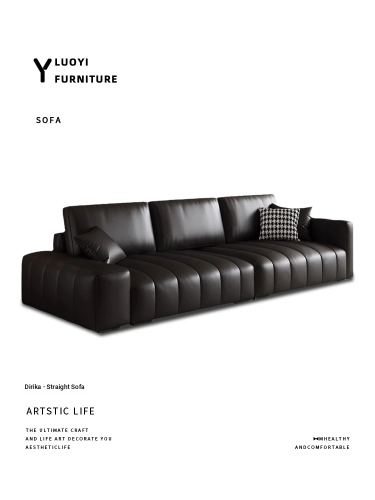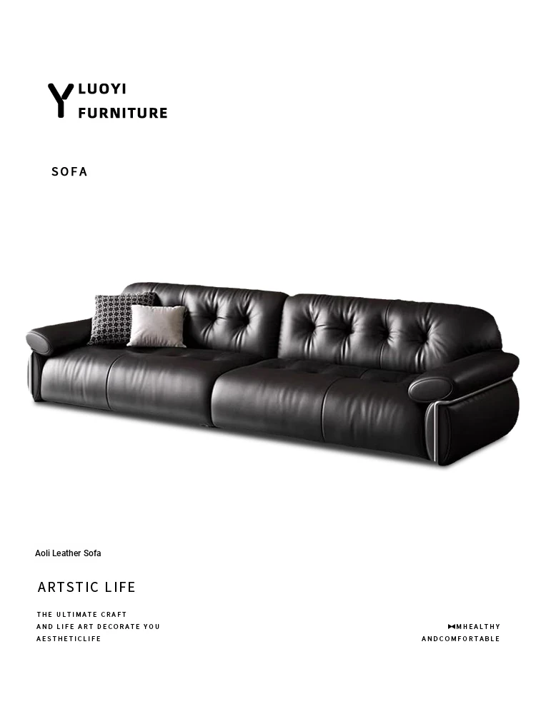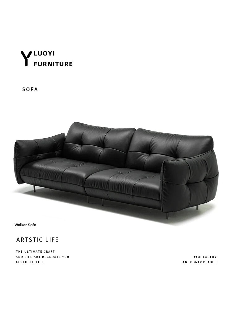 Aolisha Italian Minimalist Black Vintage Sofa - French Chic Light Luxury Straight-Line Top Grain Leather Living Room Couch