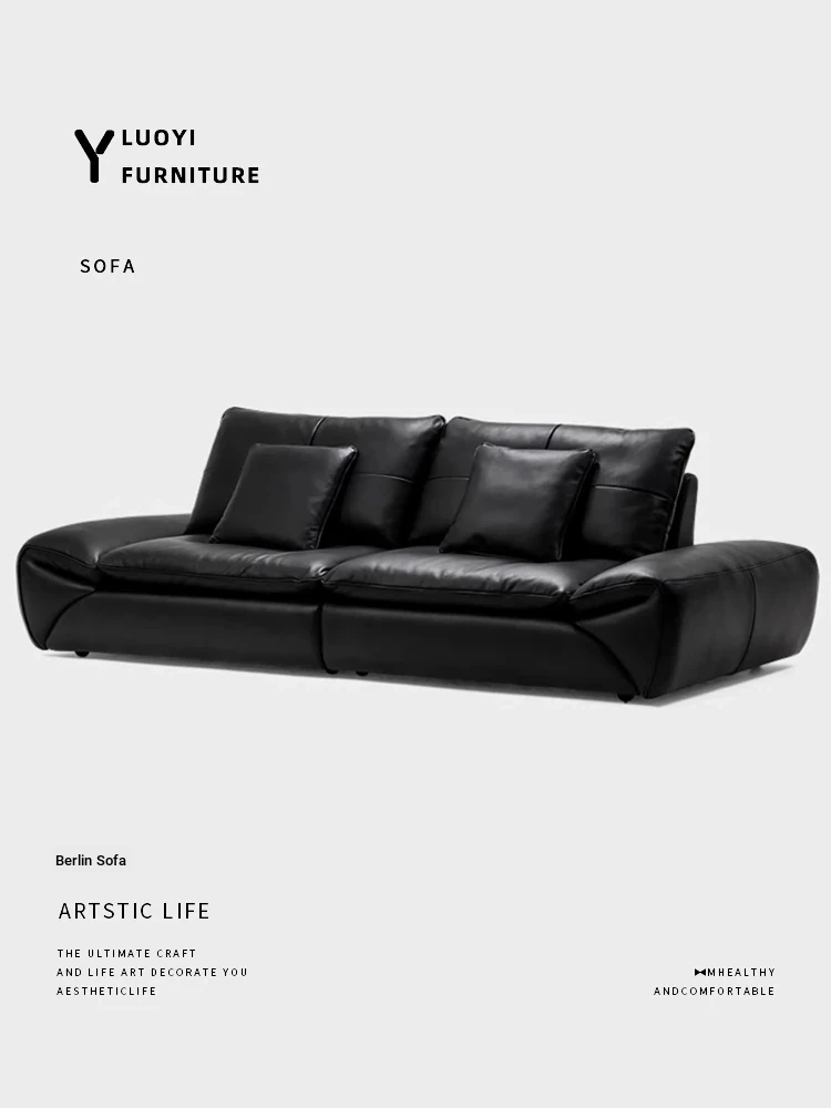 Italian Minimalist Genuine Leather Sofa - Black Top-Grain Cowhide High-Back Design for a Vintage Living Room, Embracing Comfort with Plush Down-Filled Upholstery