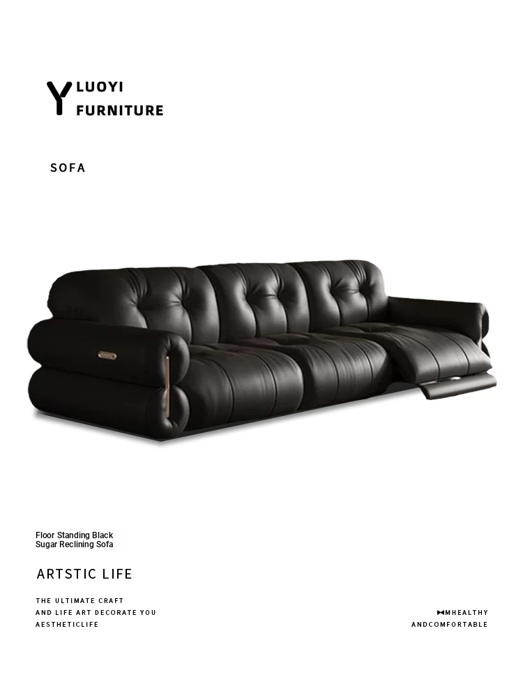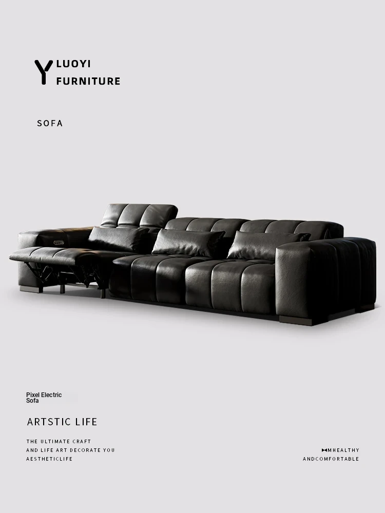 Adjustable Pixel Electric Reclining Sofa - Italian Style, Perfect for Spacious Living Rooms. Features High Back Support, Wall-Free Design, and Luxurious Black Top-Grain Leather. Elevate Your Comfort and Style!