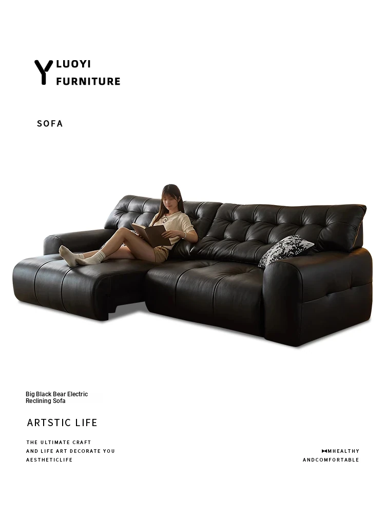 Big Black Bear Electric Sofa - Italian Minimalist Design, Genuine Top-Grain Leather, Black Color, Wall-Hugging, Multi-Functional, Adjustable High Backrest Sofa. Perfect for Modern Living Spaces!