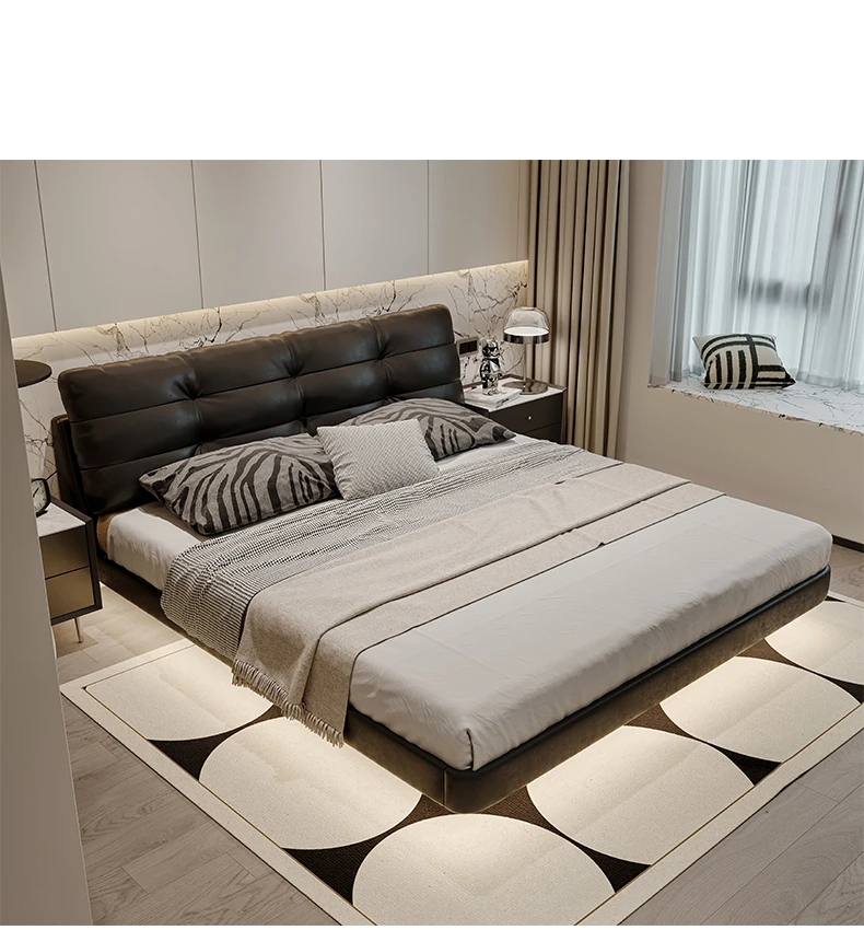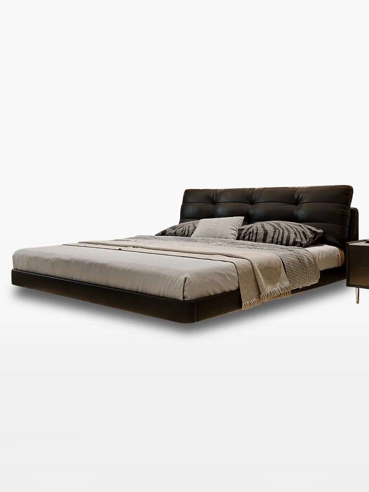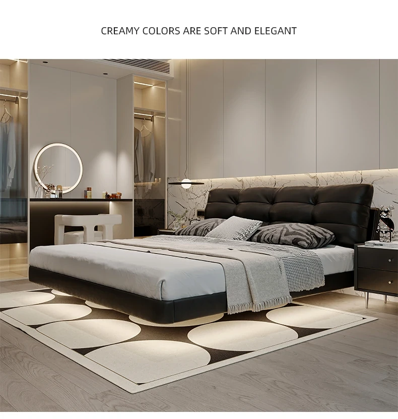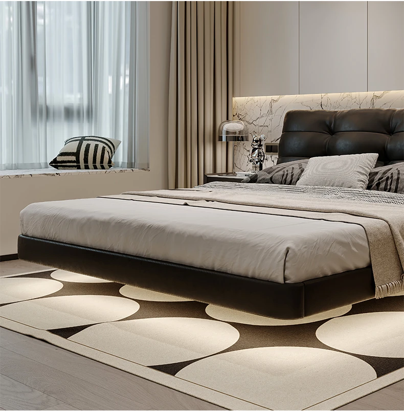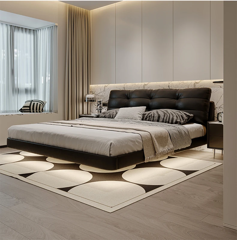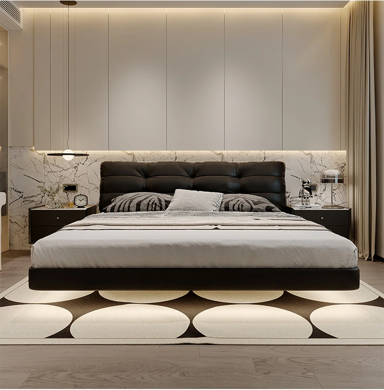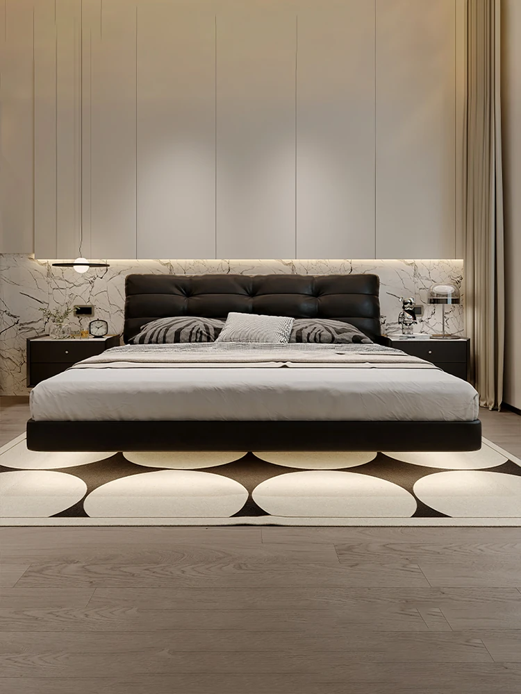 Cloud Floating Bed - Italian Minimalist Black Genuine Leather Modern French Light Luxury Upholstered Bed with Cozy Down Padding - Perfect for Trendy Spaces!