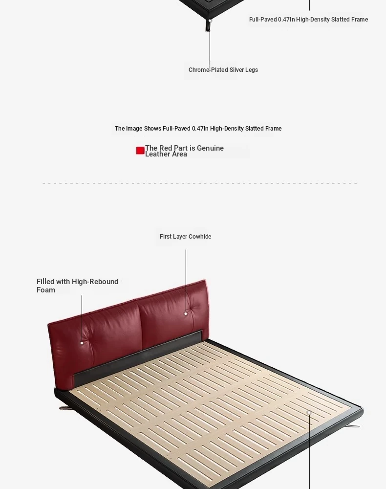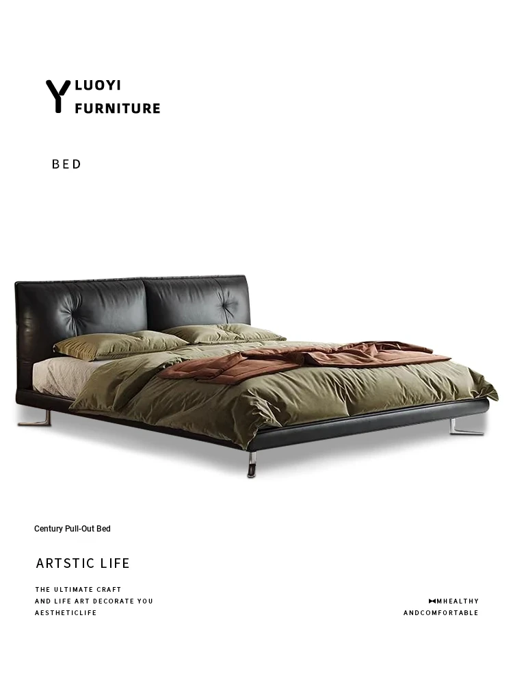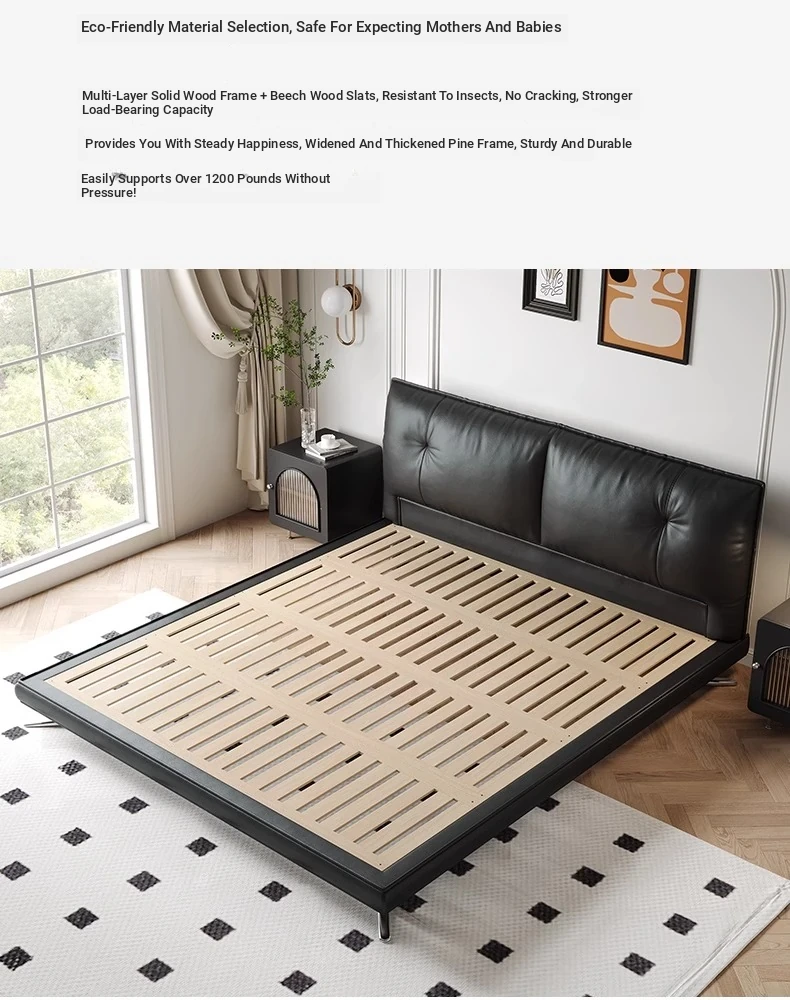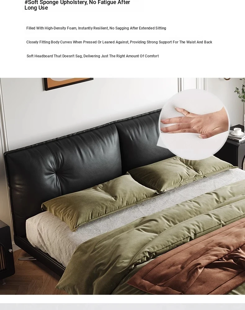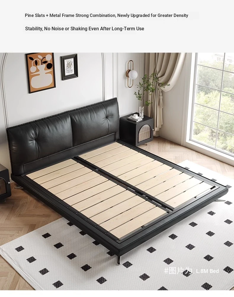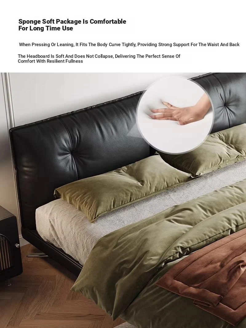 Italian Minimalist Genuine Leather Bed - Modern Simple Design with Top-Grain Cowhide and Soft Padding, Perfect for Master Bedrooms. Stylish Nordic Edge-to-Edge Leather Double Bed.