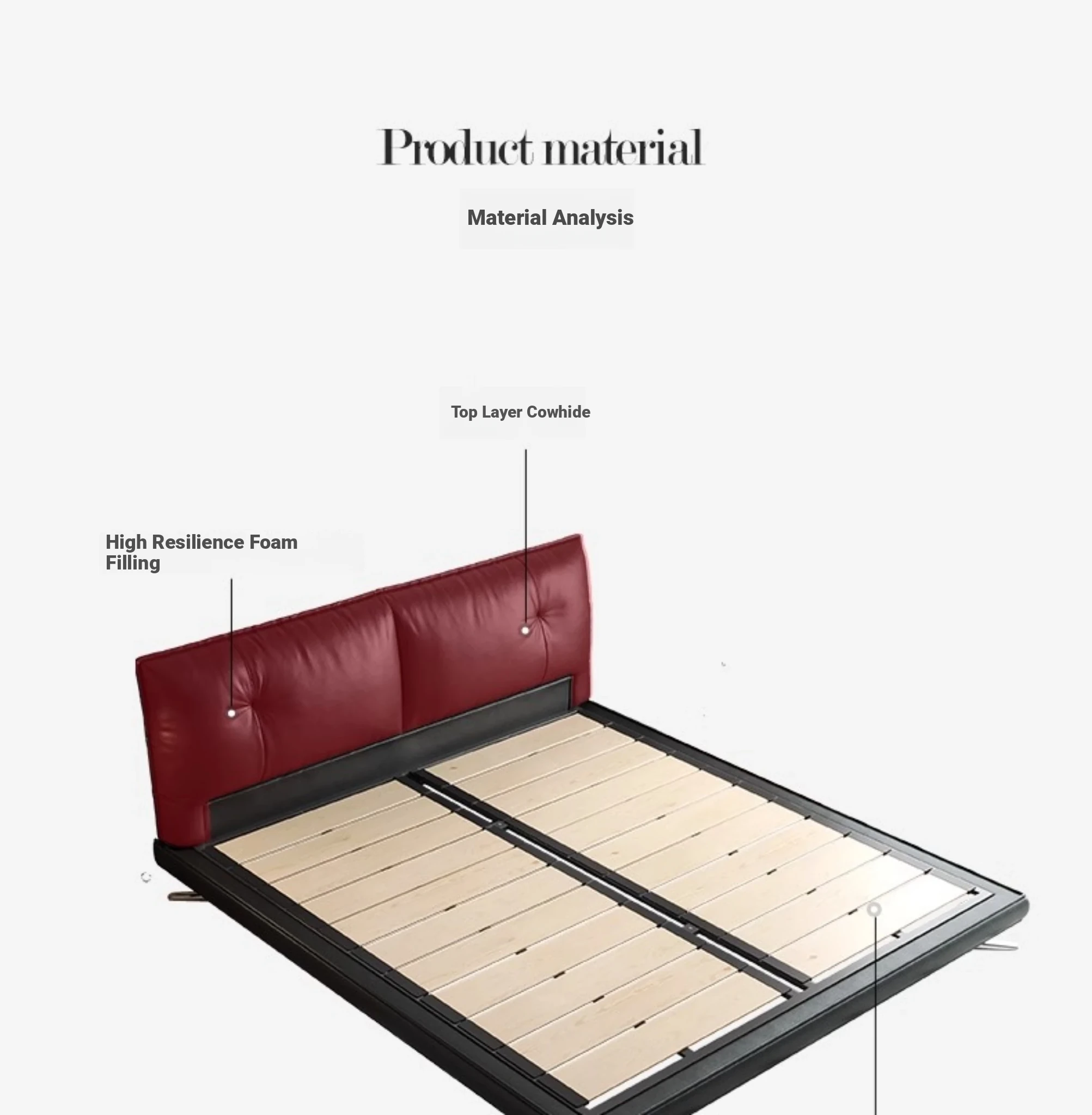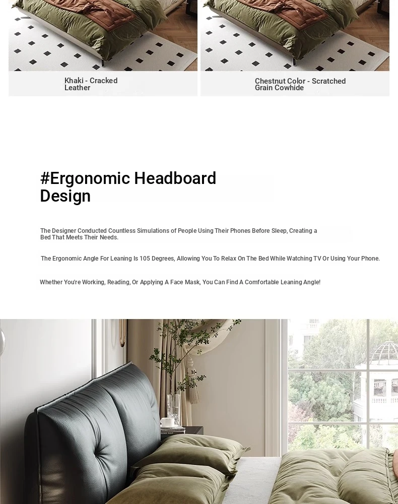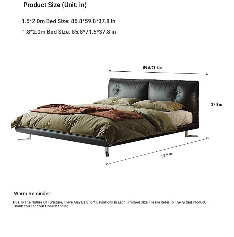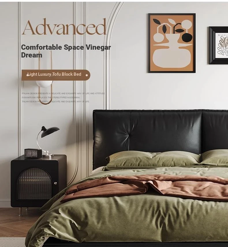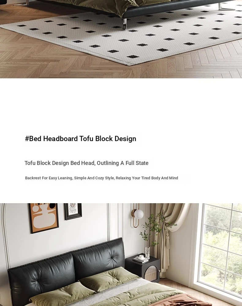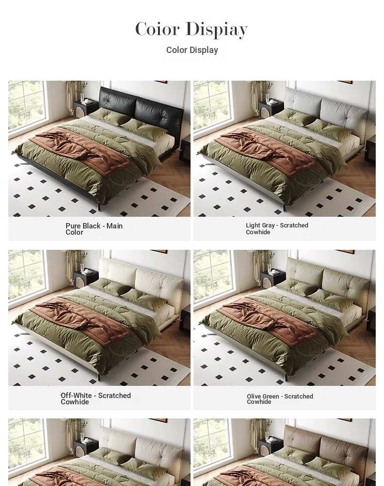 Italian Minimalist Genuine Leather Bed - Modern Simple Design with Top-Grain Cowhide and Soft Padding, Perfect for Master Bedrooms. Stylish Nordic Edge-to-Edge Leather Double Bed.