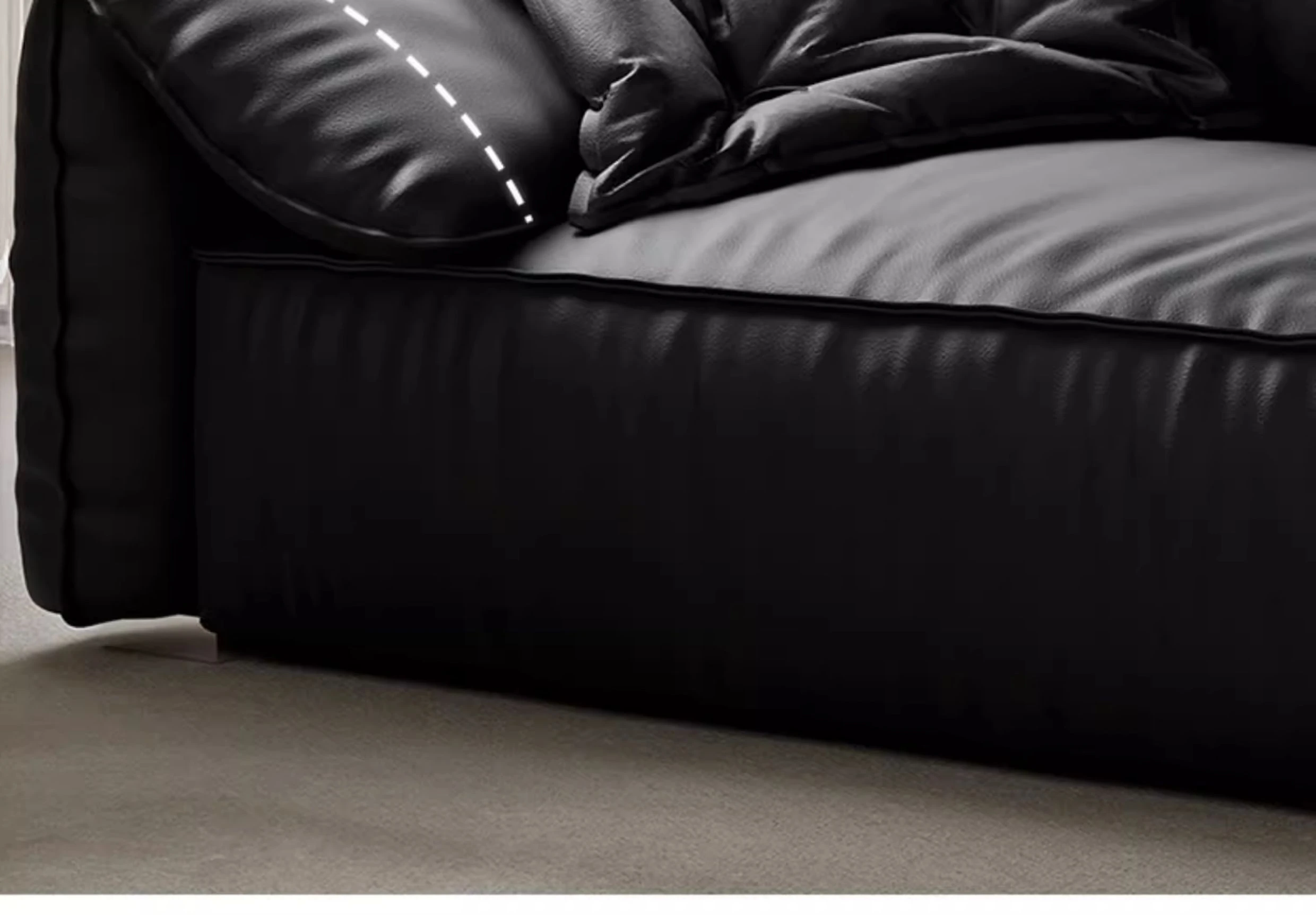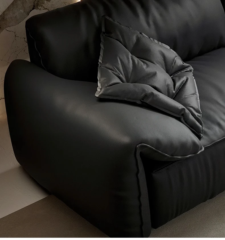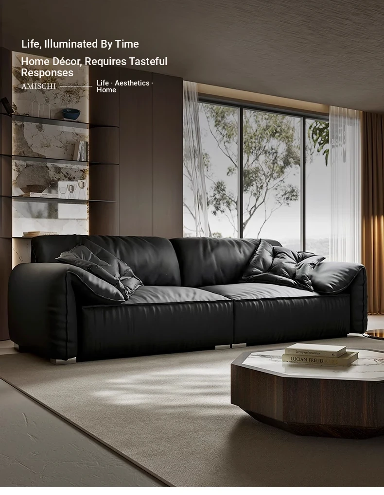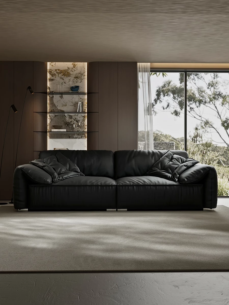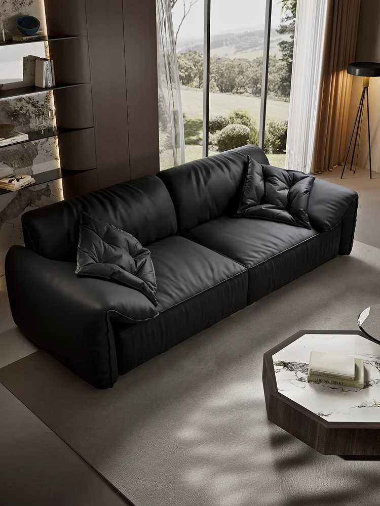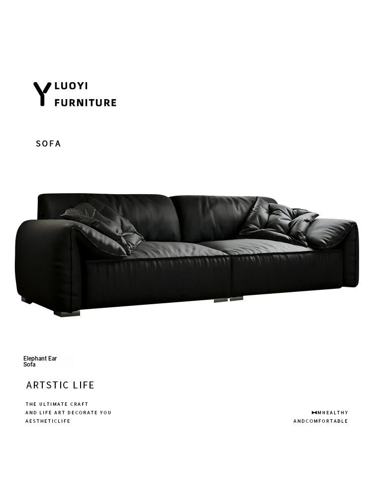 Italian Minimalist Genuine Leather Sofa for Spacious Villas - Black Down-Filled Elephant Ear Design, Perfect for Large Living Rooms