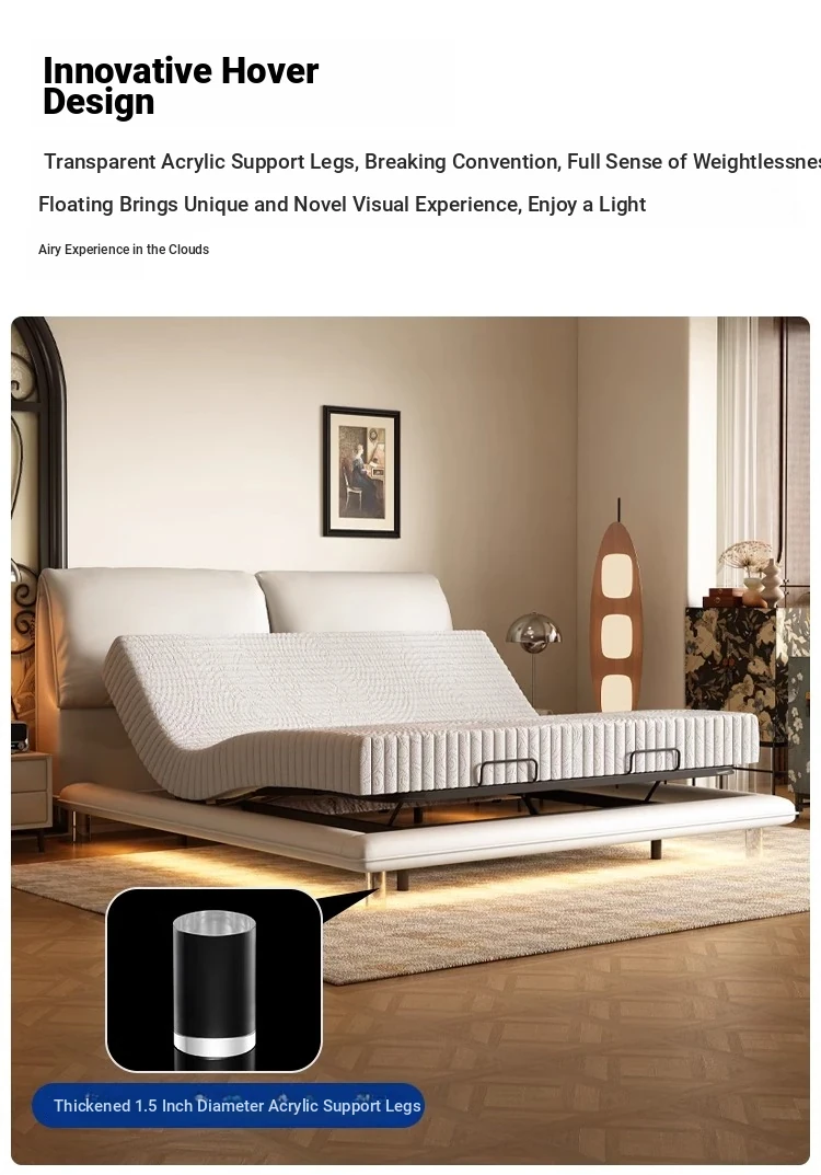 Multi-Functional Electric Elephant Ear Floating Bed - Italian Minimalist Genuine Leather Modern Smart Bed with Remote Control Adjustable Height