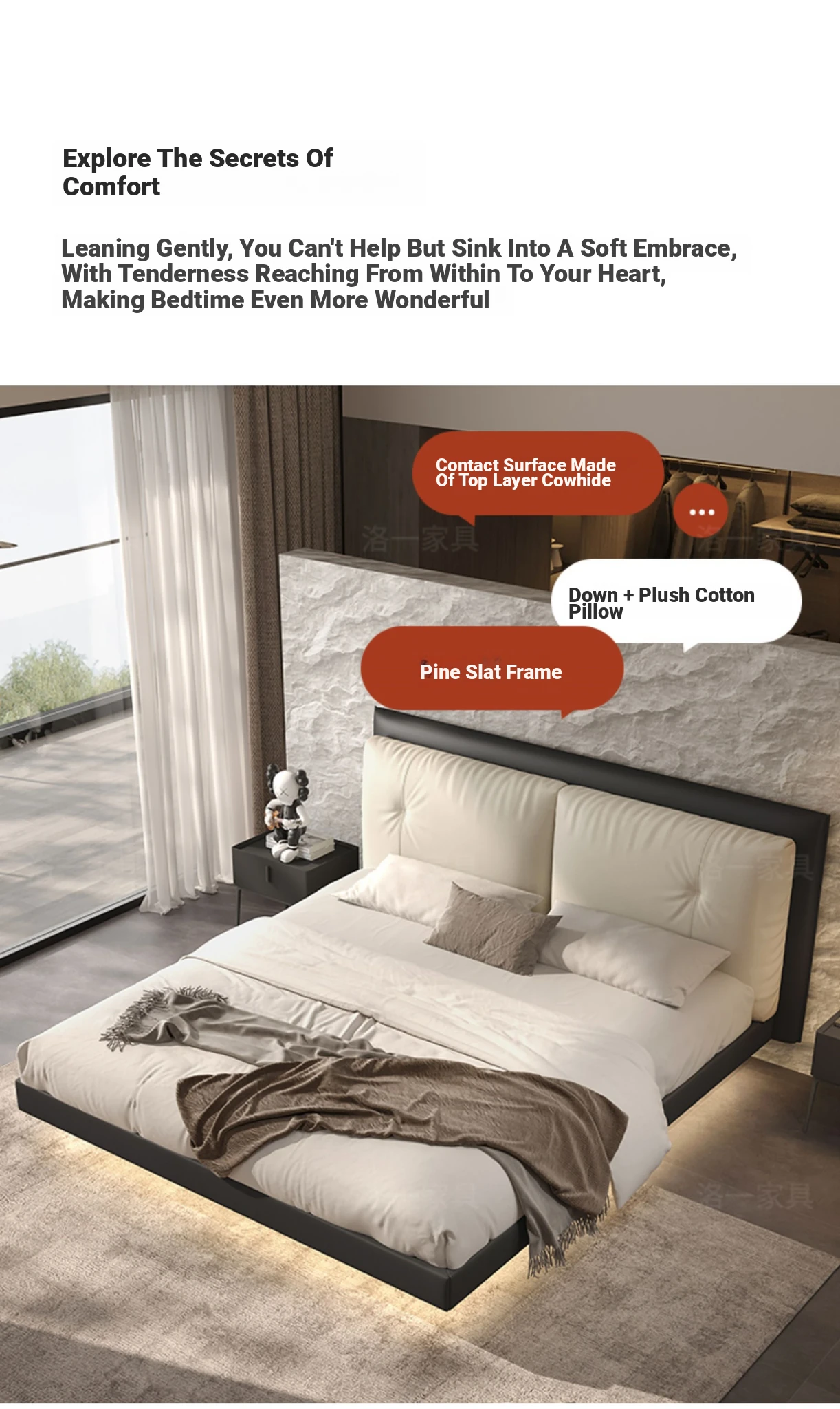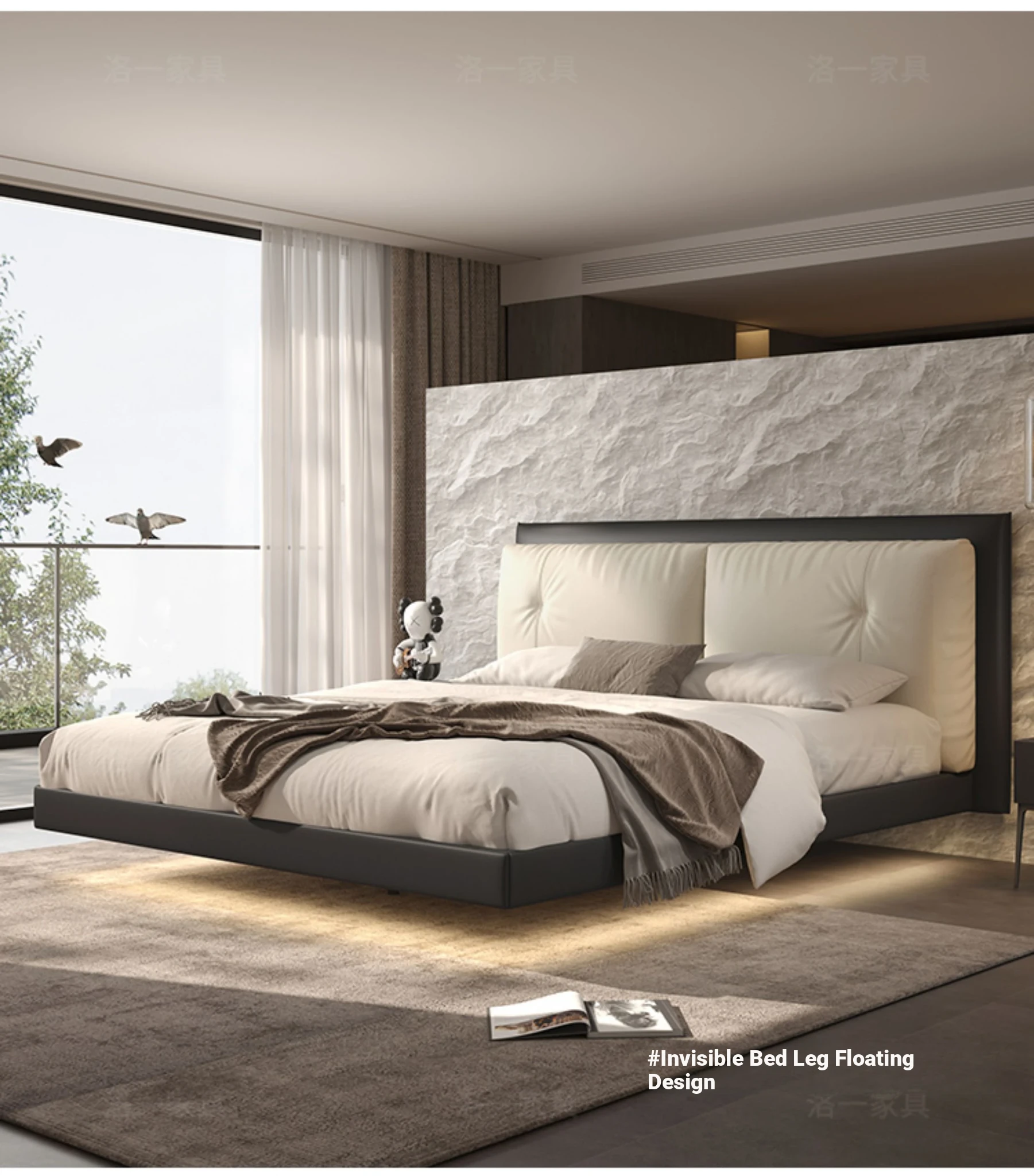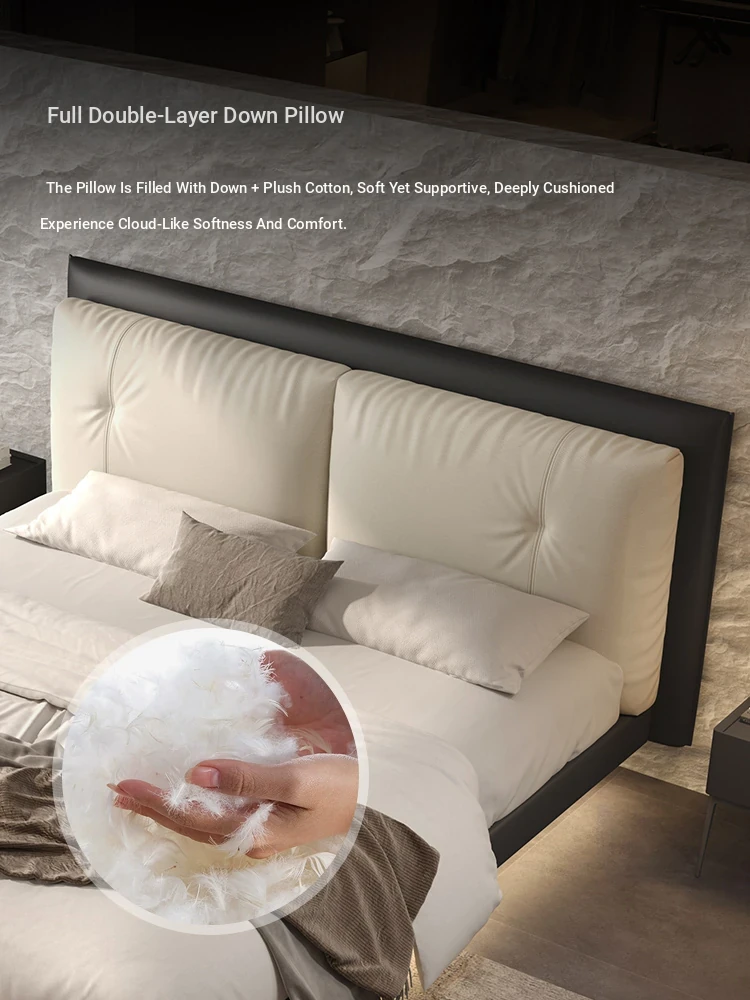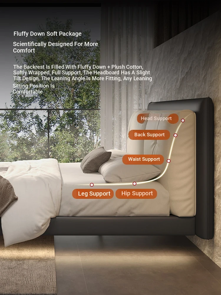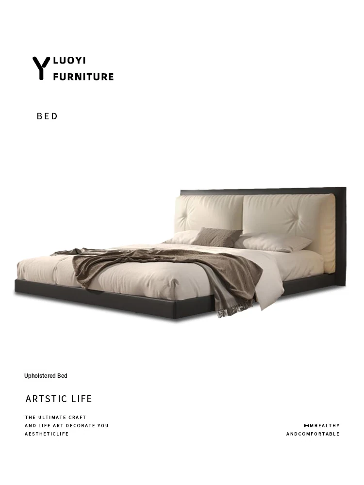 Suspended Bed - Italian Minimalist Genuine Leather Bed for Modern Master Bedrooms, Elegant Top-Grain Cowhide Upholstered Design with Soft Padding, Perfect for Newlyweds