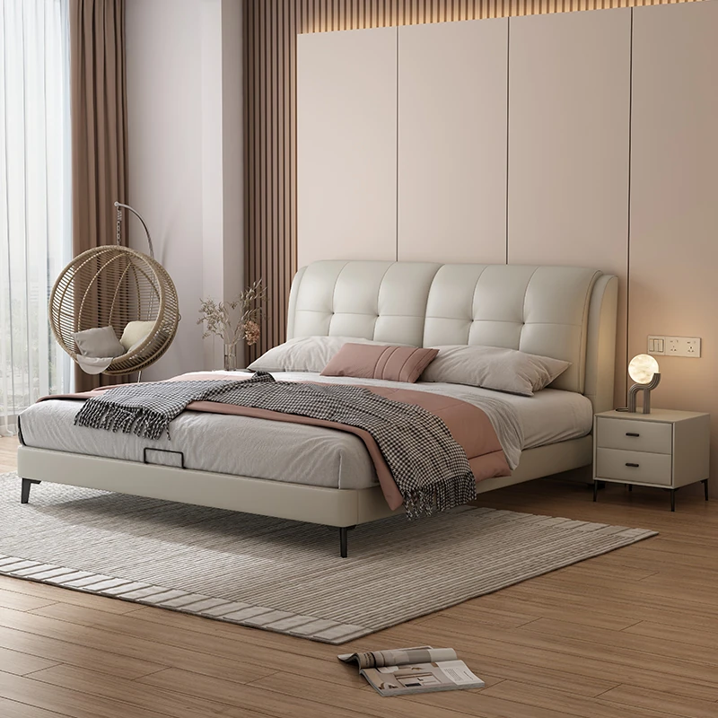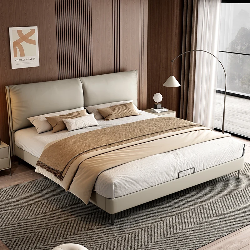 Minimalist Napa Leather Bed for Modern Small Spaces - Creamy Style Master Bedroom Double Bed, Available in 1.5m and 1.8m with High Storage Box. Perfect for Stylish Living!