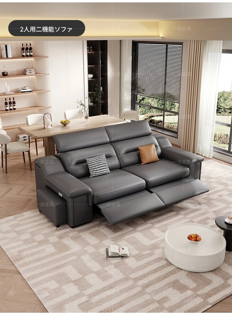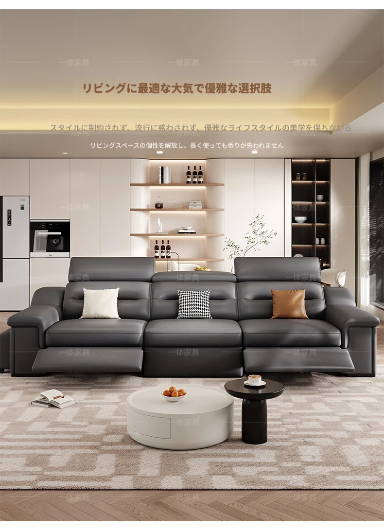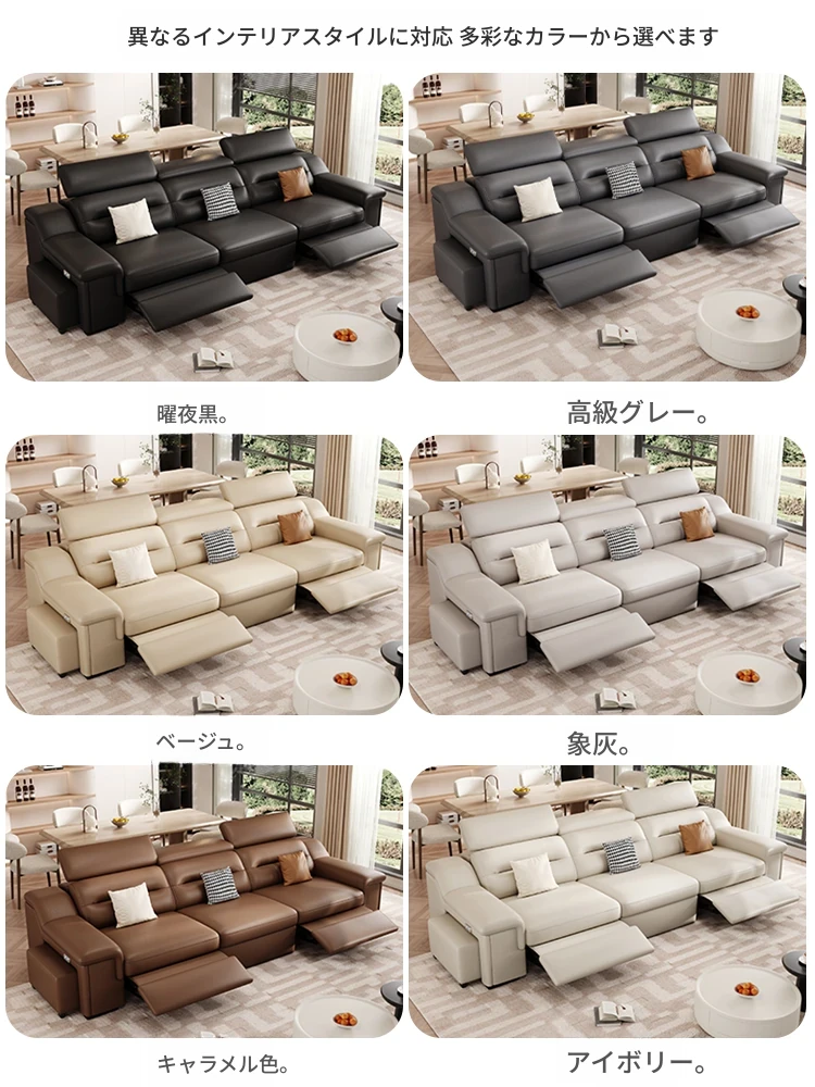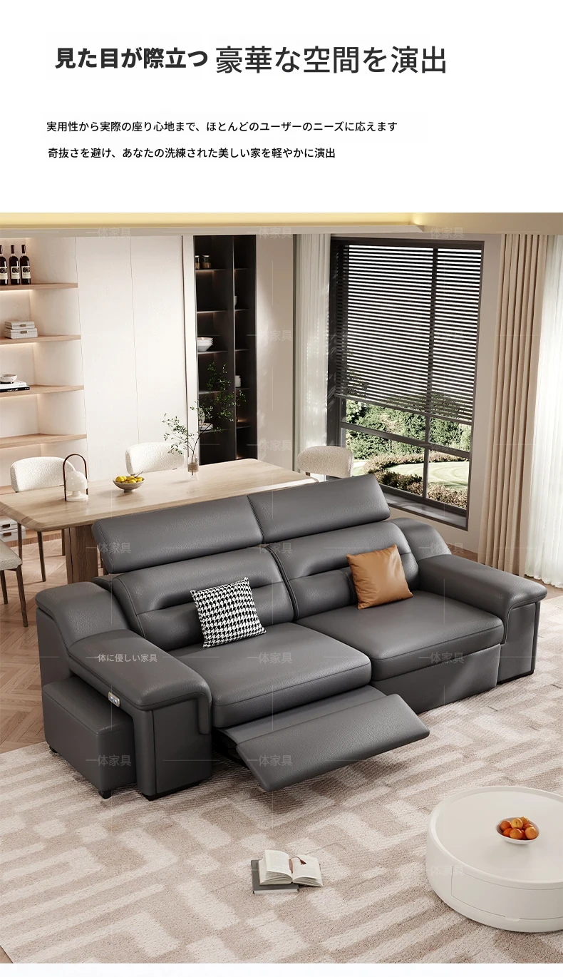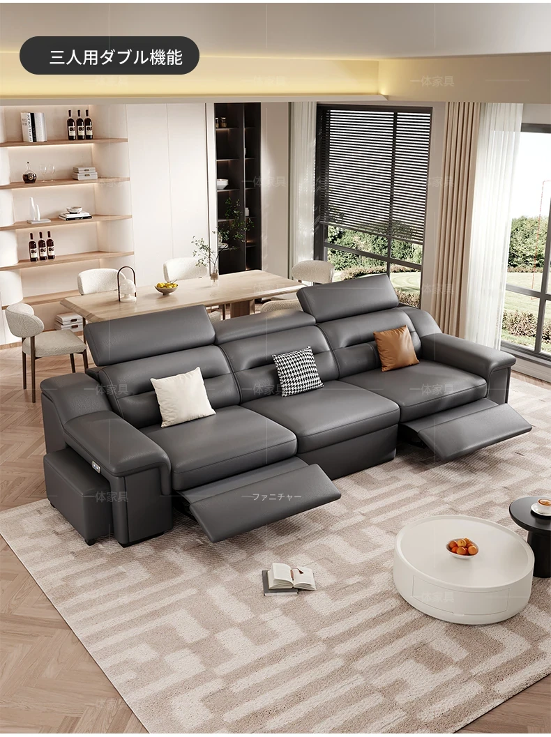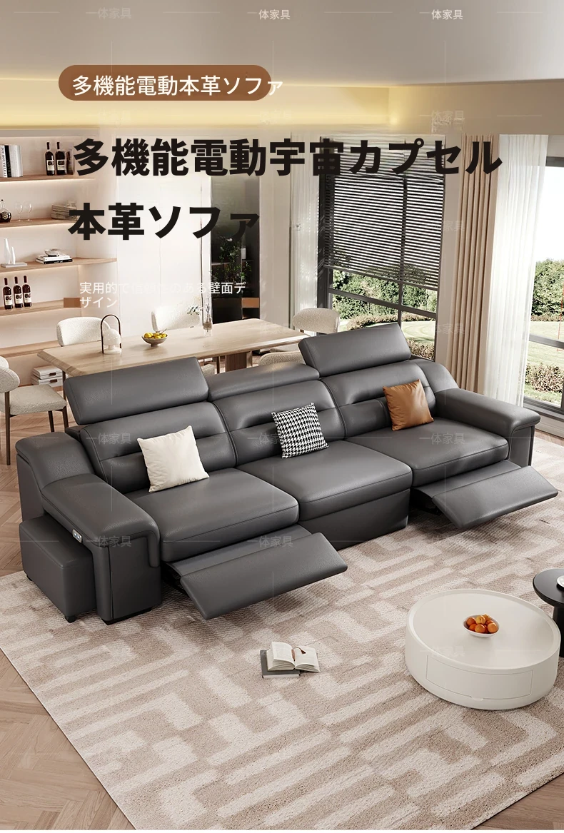 本革製の機能付き電動伸縮ソファー - 調節可能なスペースカプセルデザイン!家庭用シアターに最適なリビング向け、壁際でも置けるスリムな3人掛けソファ。快適な座り心地で、映画鑑賞やリラックスタイムを贅沢に演出!