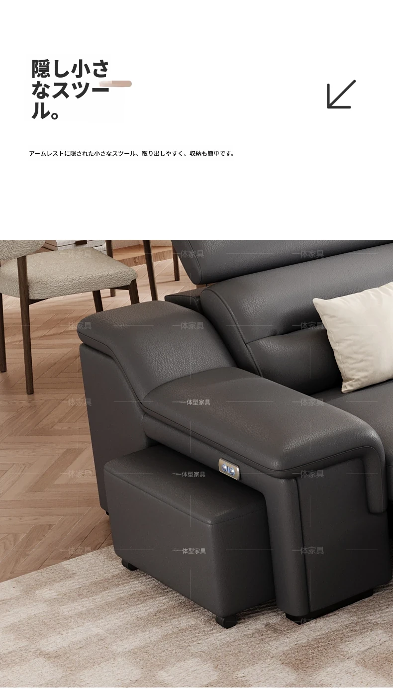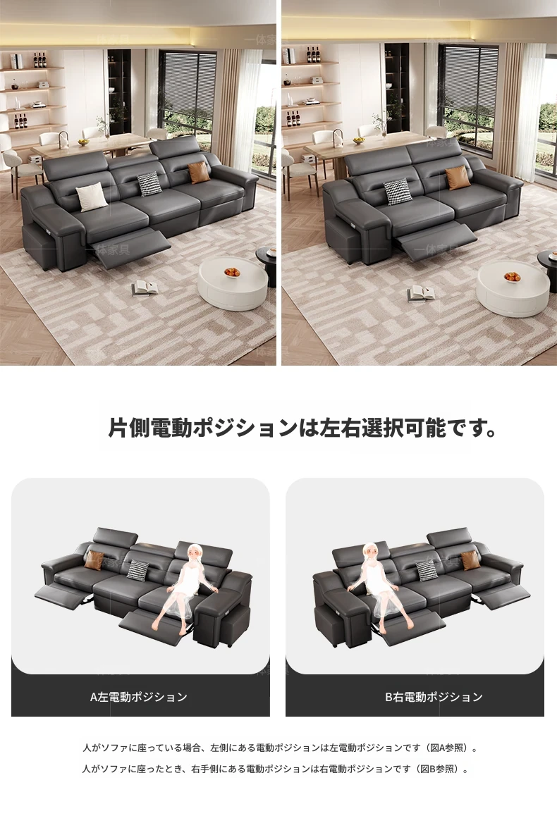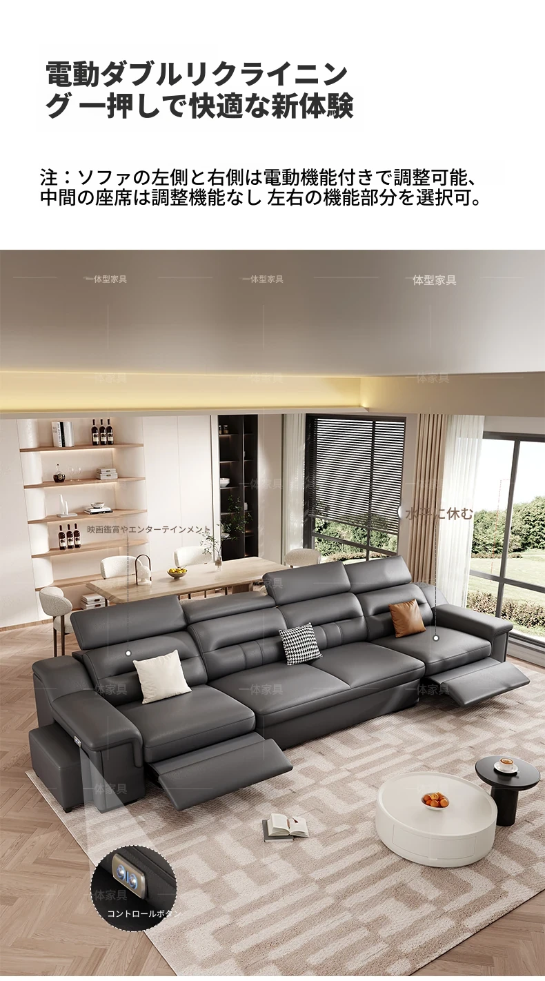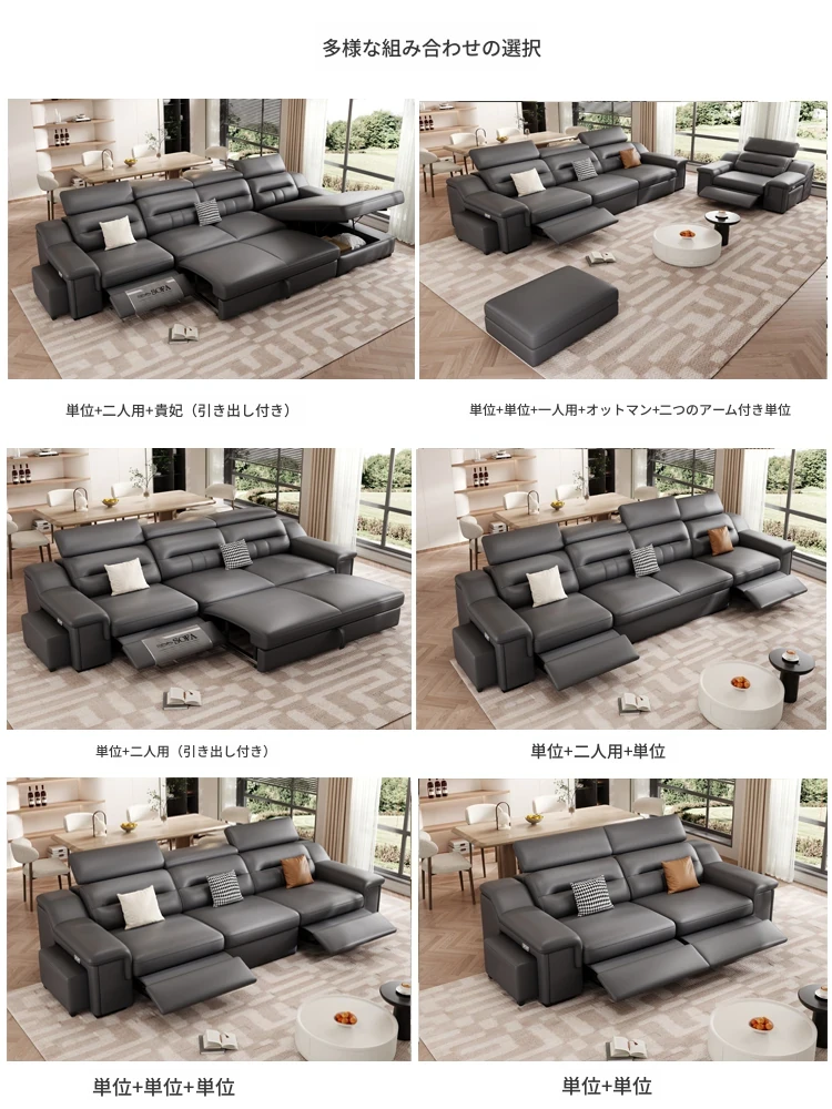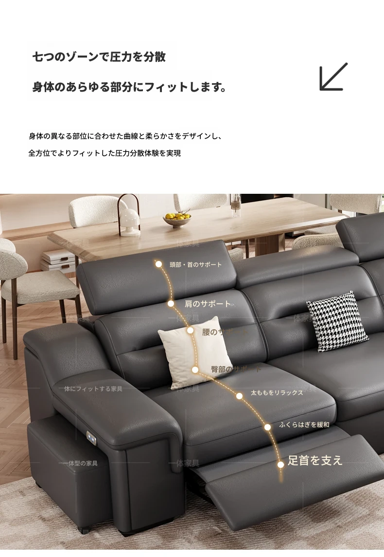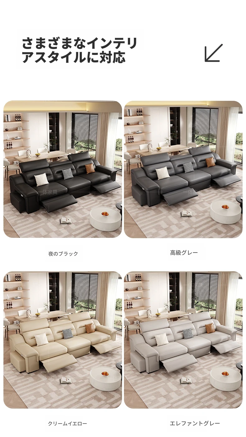 本革製の機能付き電動伸縮ソファー - 調節可能なスペースカプセルデザイン!家庭用シアターに最適なリビング向け、壁際でも置けるスリムな3人掛けソファ。快適な座り心地で、映画鑑賞やリラックスタイムを贅沢に演出!