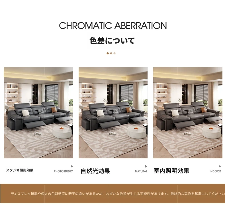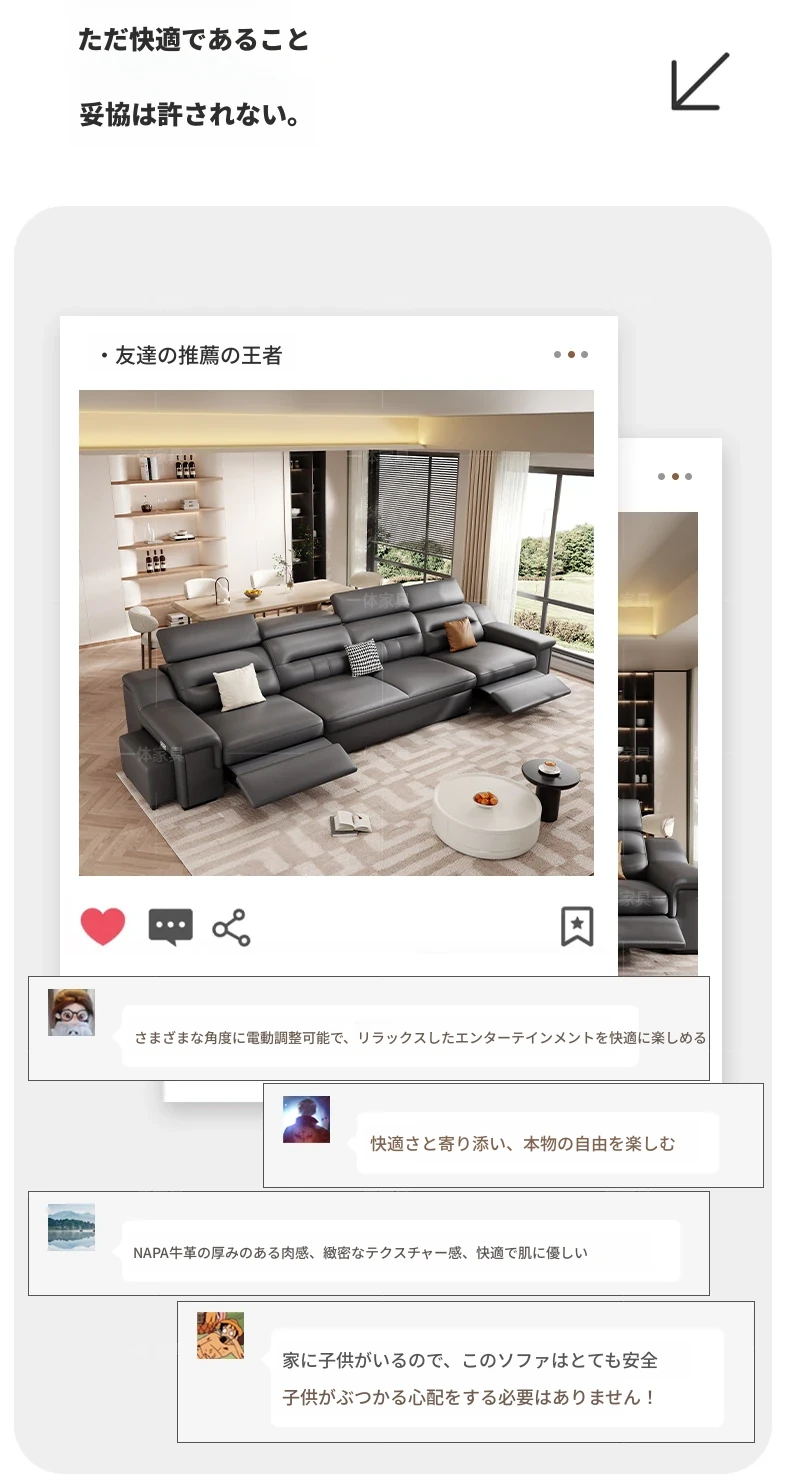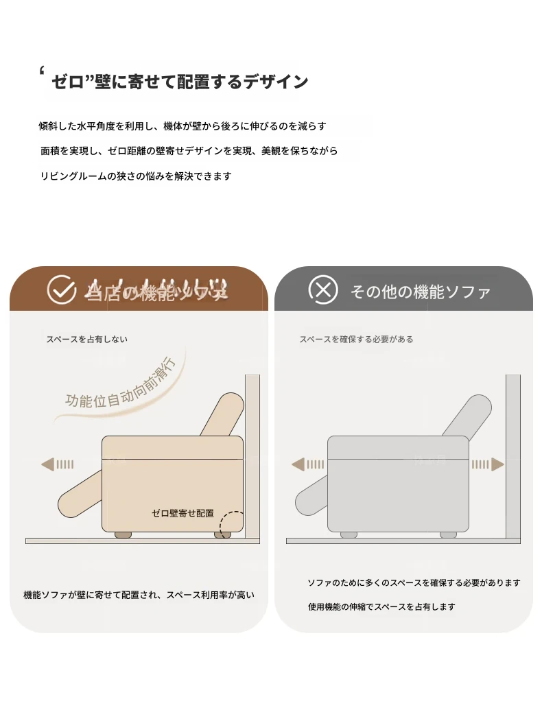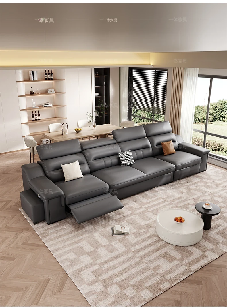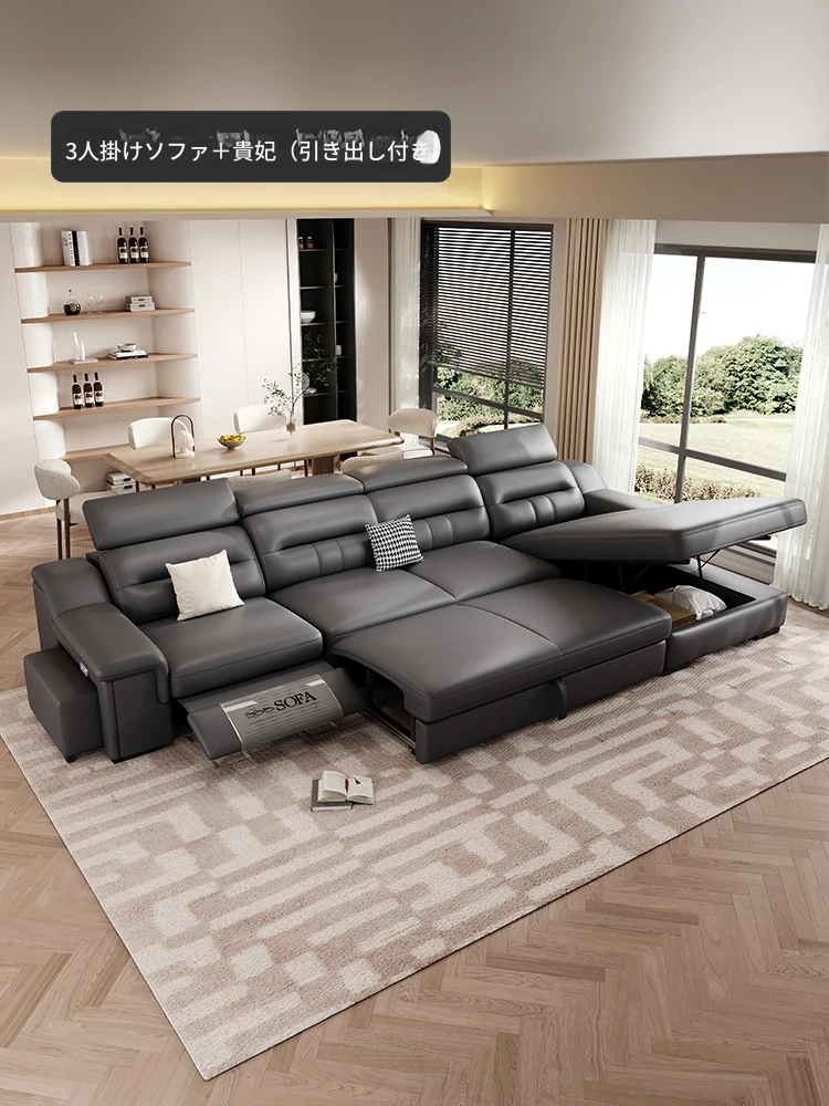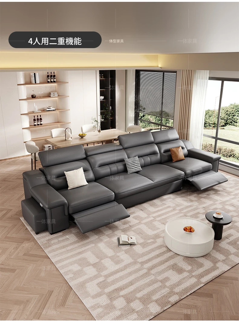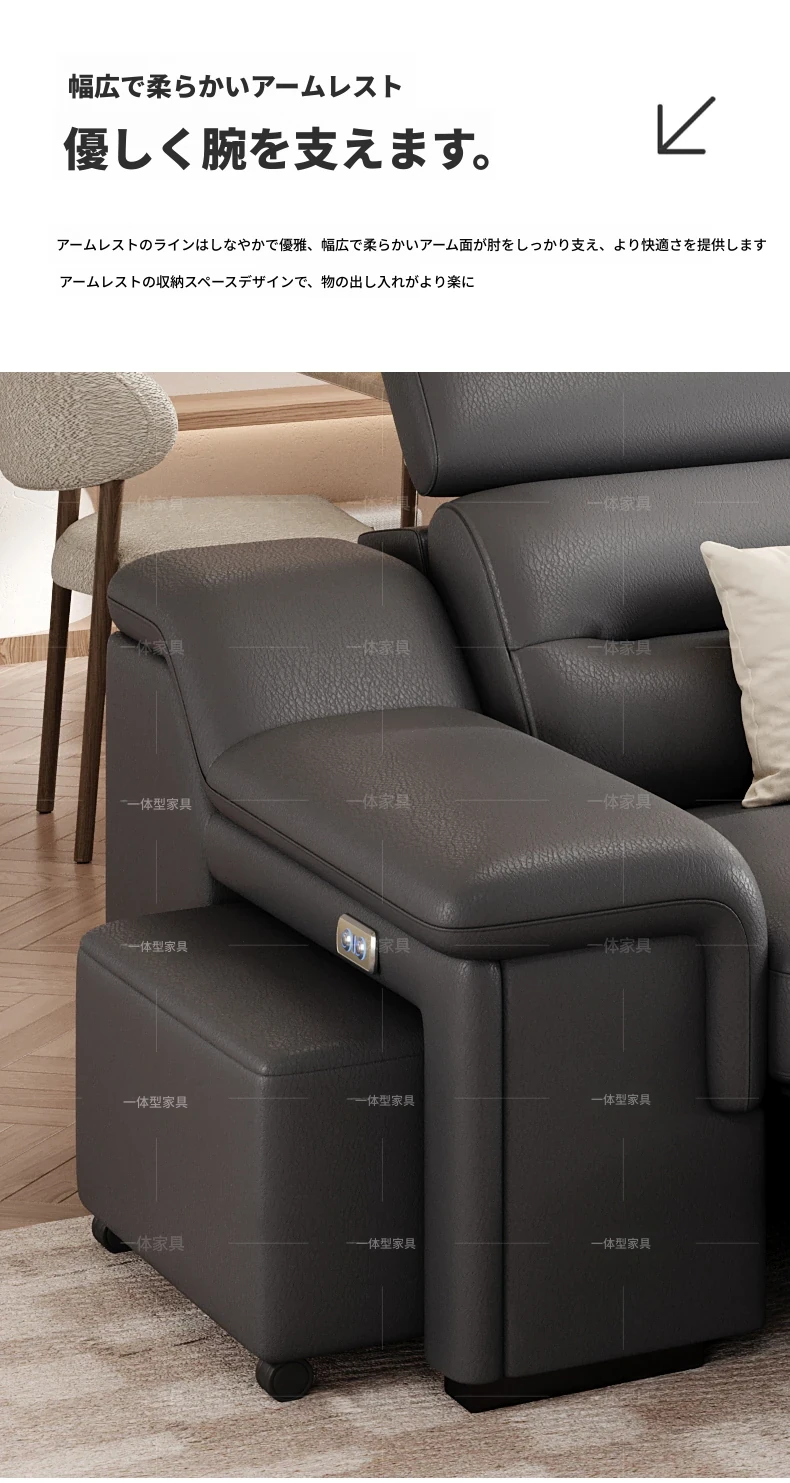 本革製の機能付き電動伸縮ソファー - 調節可能なスペースカプセルデザイン!家庭用シアターに最適なリビング向け、壁際でも置けるスリムな3人掛けソファ。快適な座り心地で、映画鑑賞やリラックスタイムを贅沢に演出!