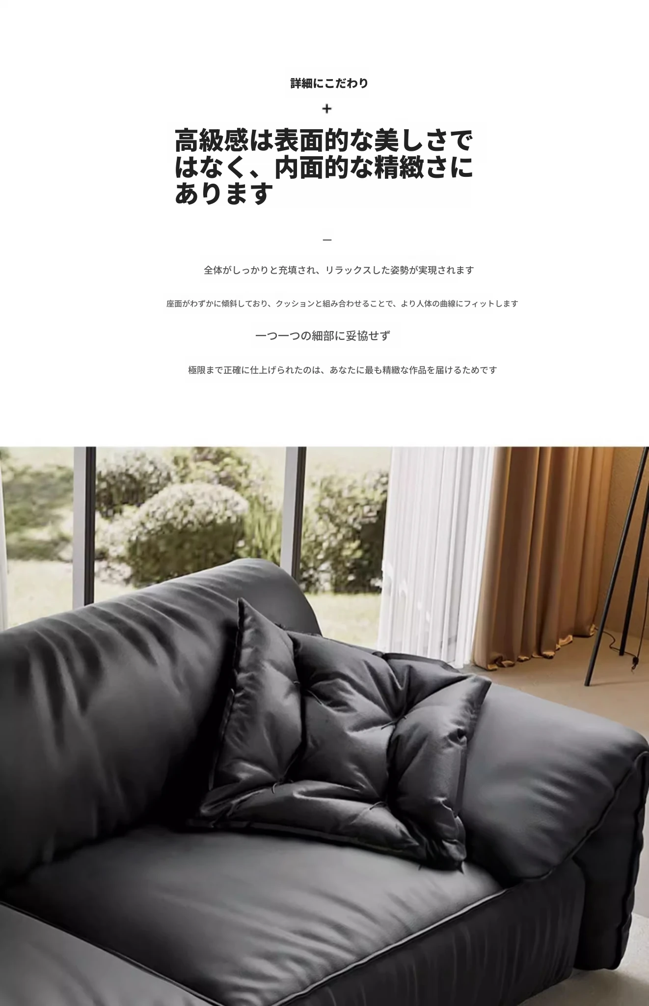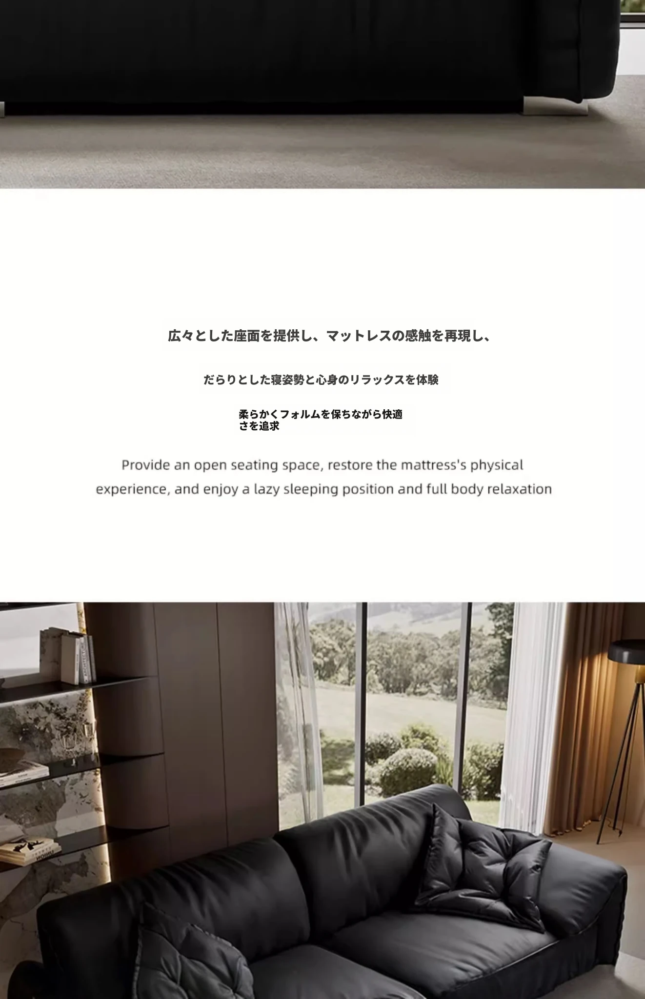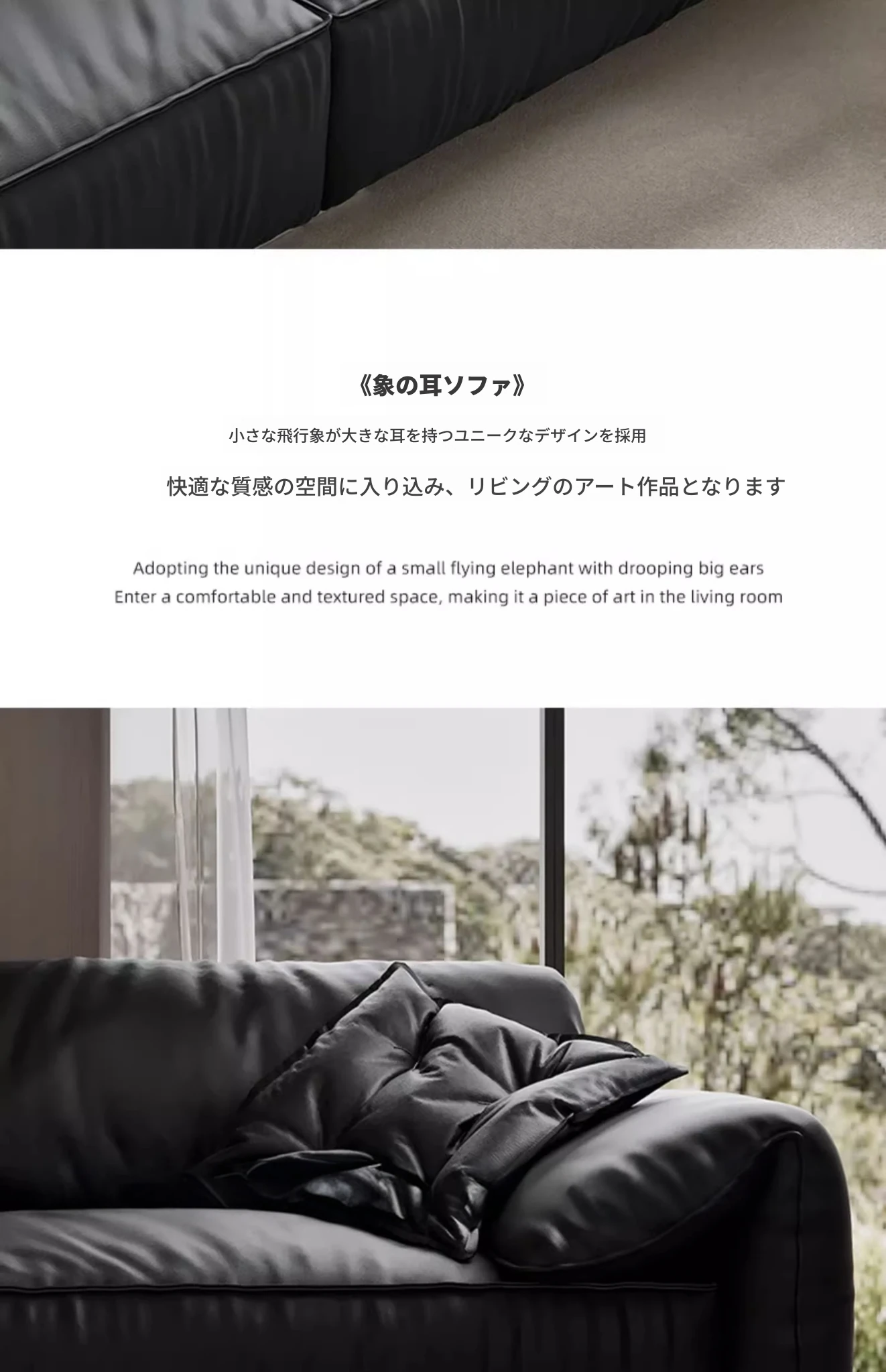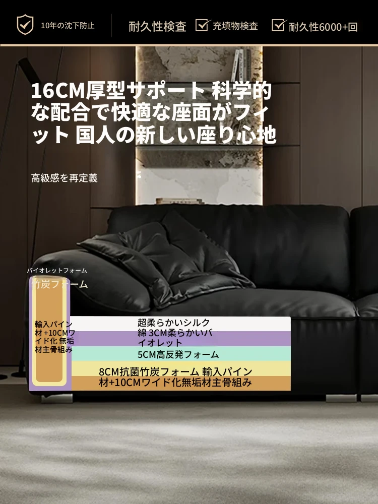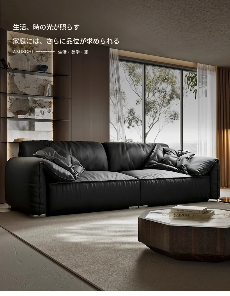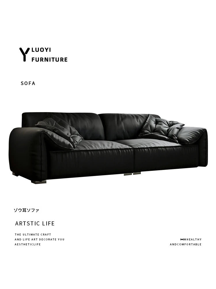 本革製イタリアンミニマリストヴィラ用リビングルーム向け、半アニリン仕上げのブラックダウン・エレファントイヤー本革ストレートソファ。洗練されたデザインで、贅沢な居心地を実現!