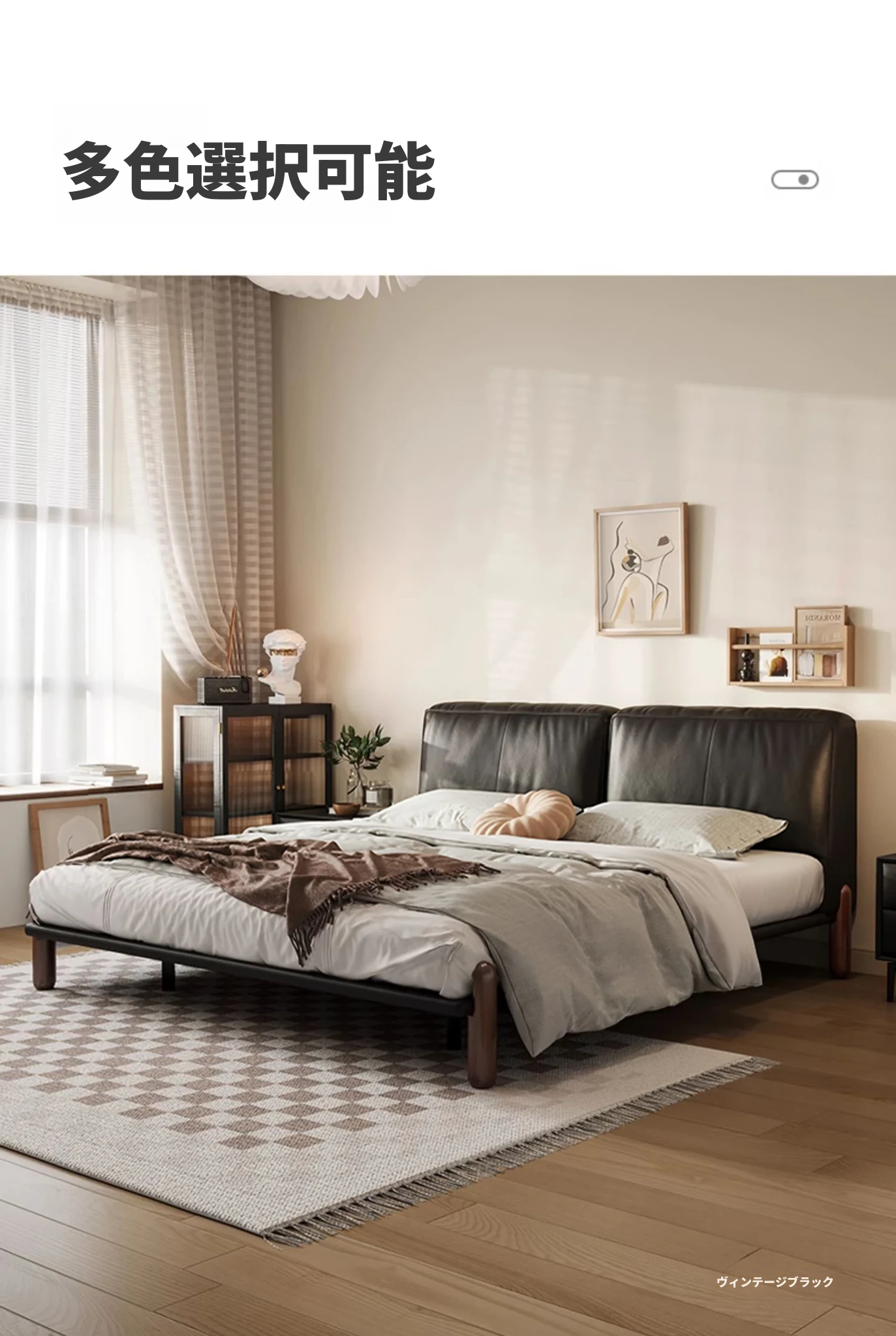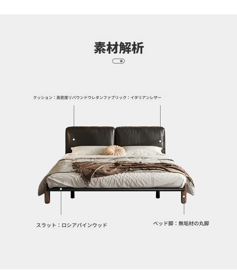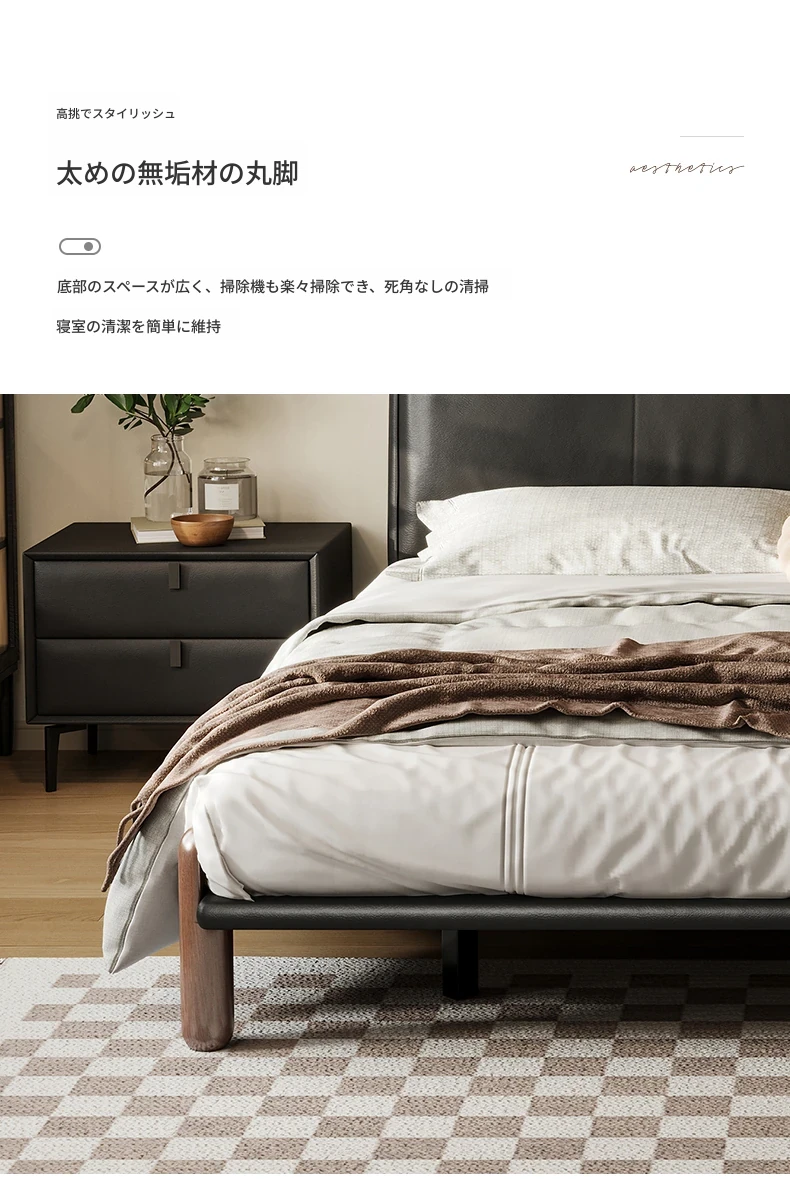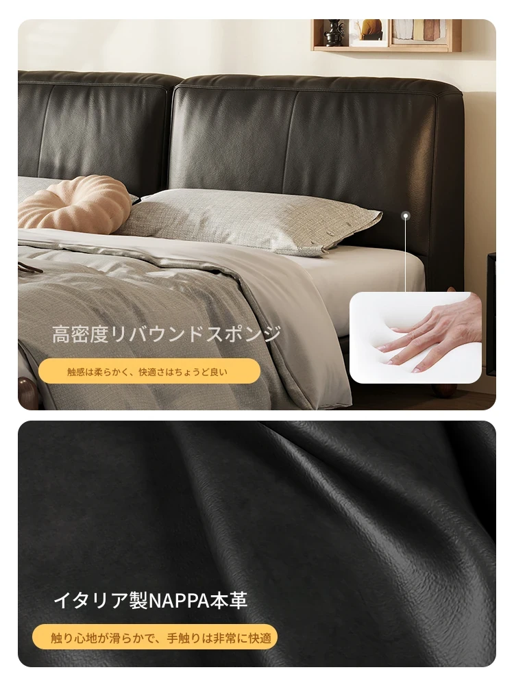 イタリアンミニマルデザインの本革トーフブロックベッド - モダンでシンプルな主寝室用、ブラックのソフトパッケージ、無垢材の脚付き、25年新作のウェディングベッド。快適さとスタイルを両立した一品です!