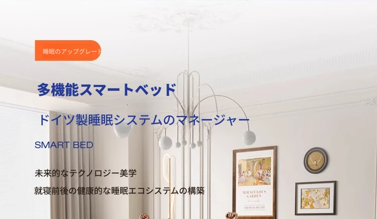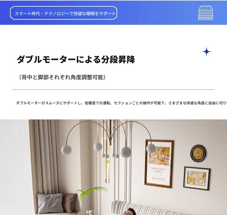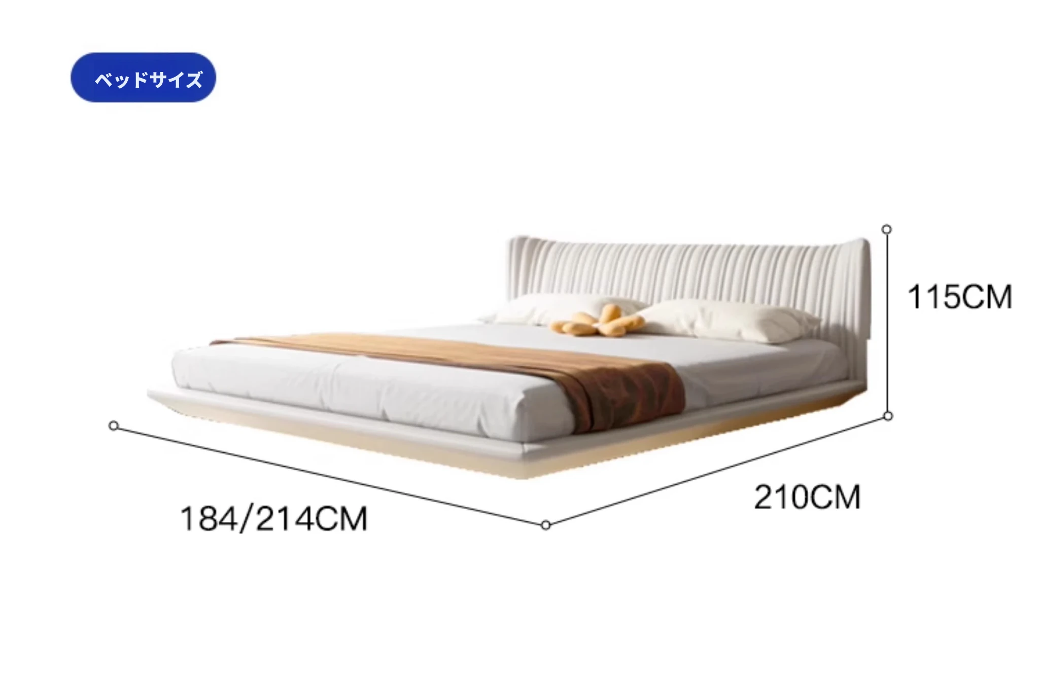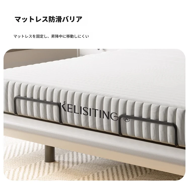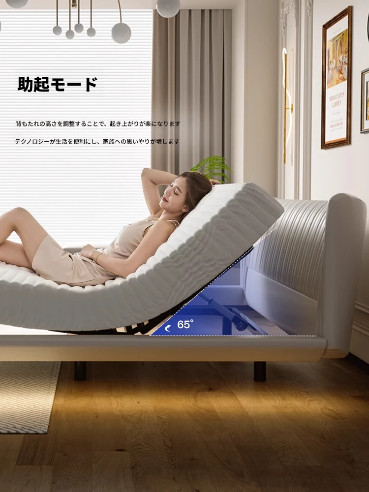 電動機能付き本革ベッド - ミニマルな浮遊デザイン、人気のクリーム風フレンチスタイル、デザイナー仕様の昇降式スリムベッド。快適な眠りとスタイリッシュな空間を演出!