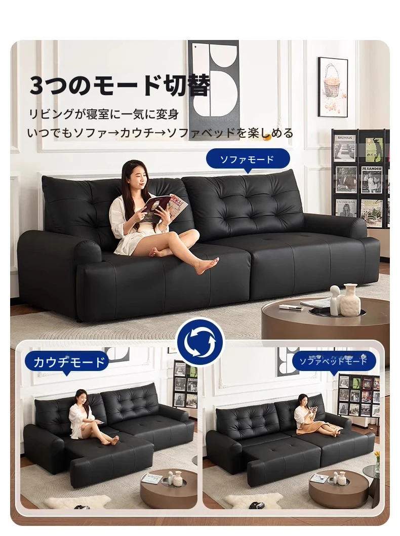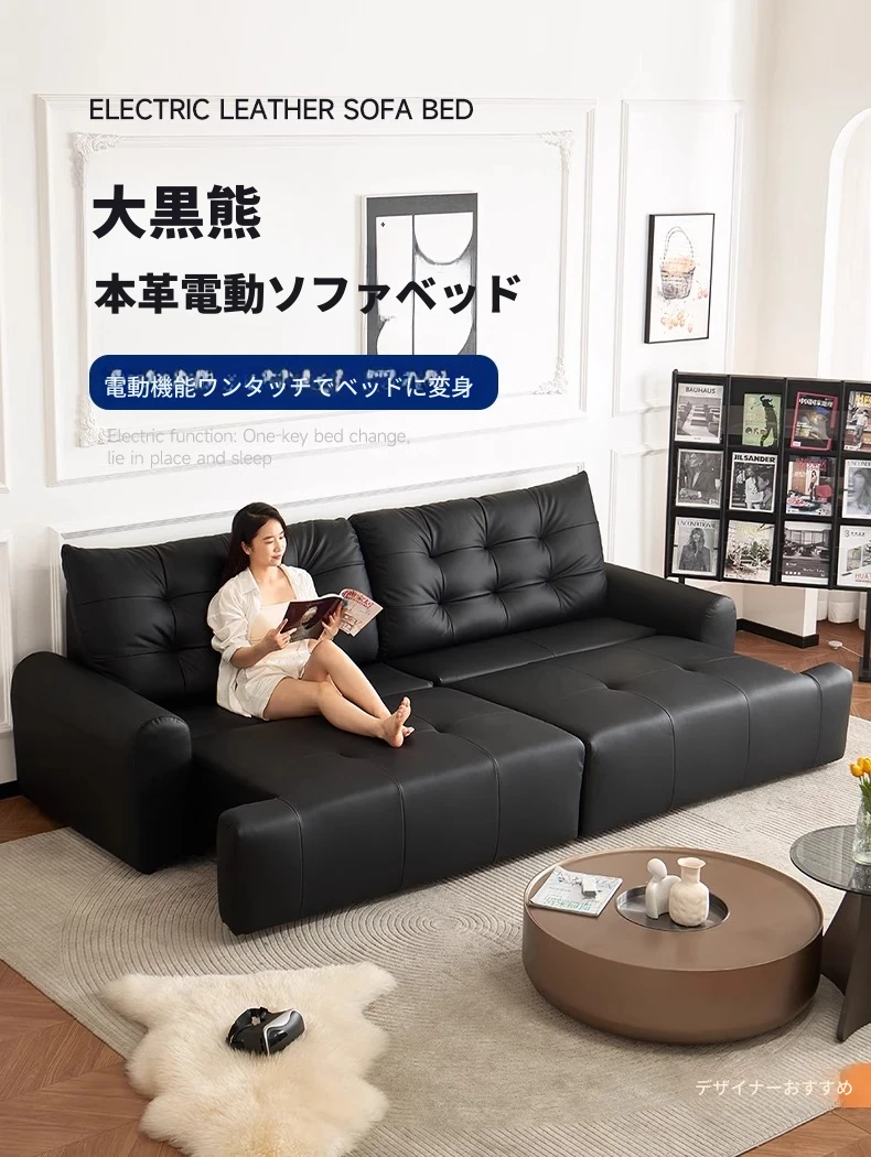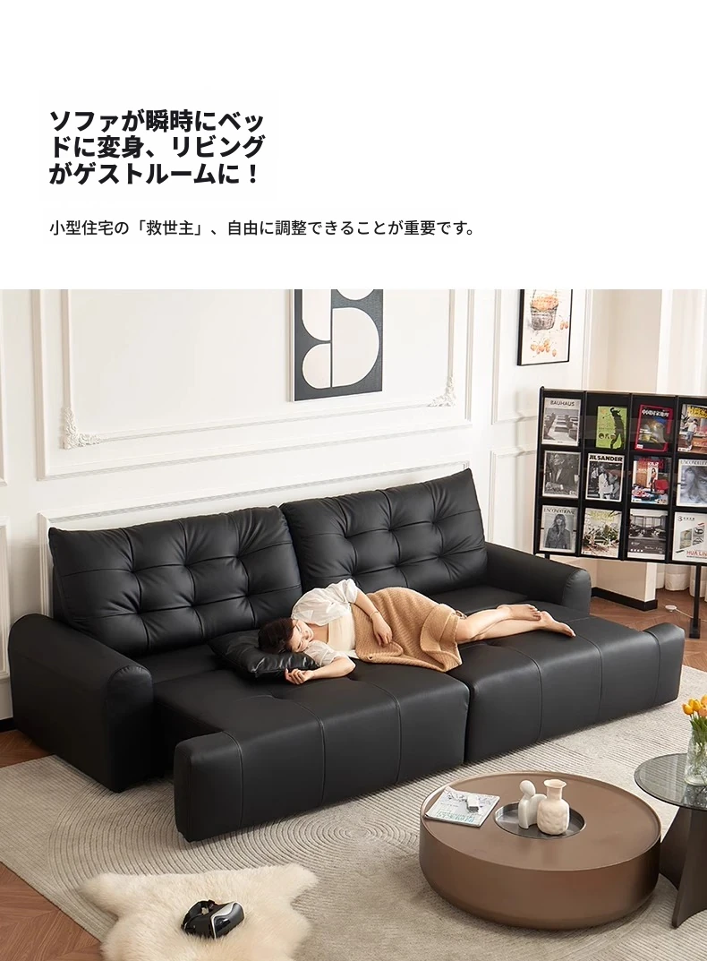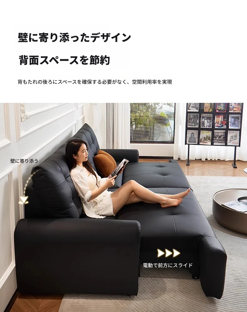 壁に寄せない電動ソファ - イタリアンミニマルデザインのブラック本革、コンパクトなリビングに最適!伸縮可能な二用途ソファベッドで、快適な休息空間を実現。