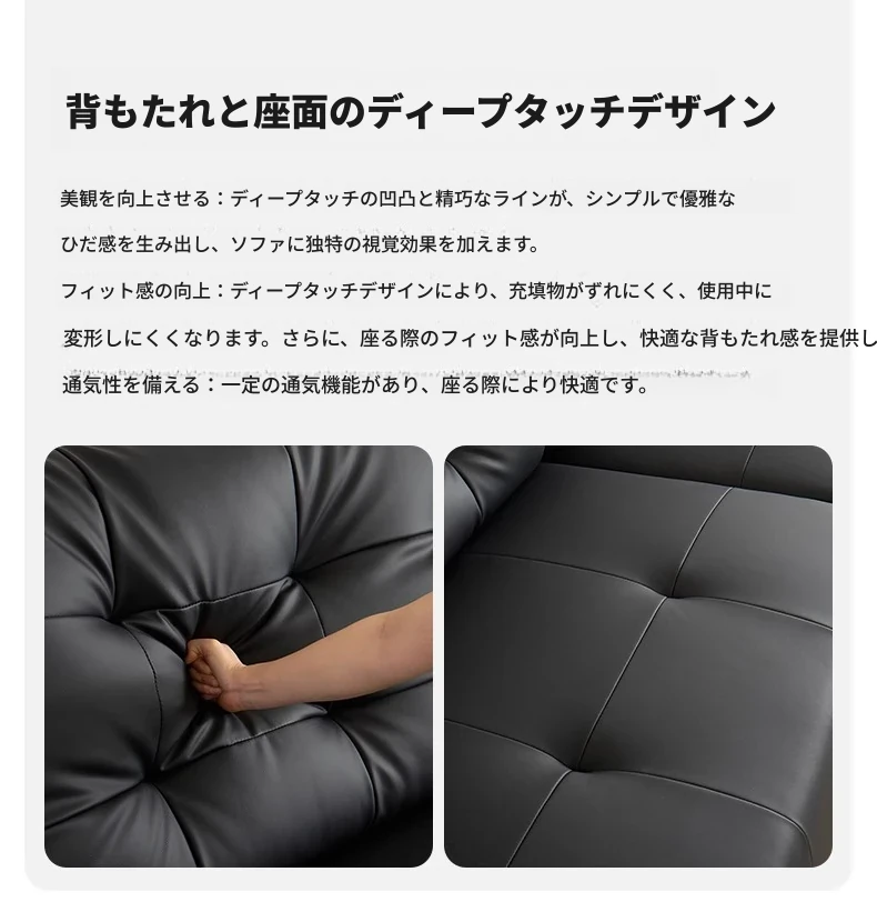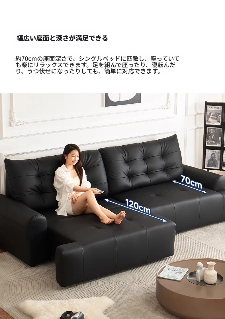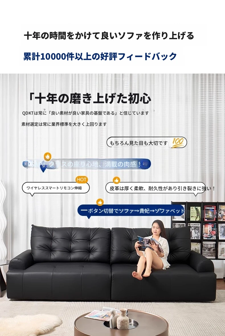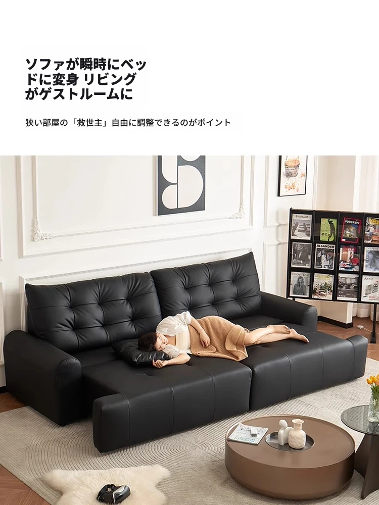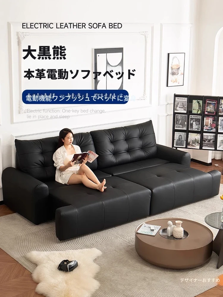 壁に寄せない電動ソファ - イタリアンミニマルデザインのブラック本革、コンパクトなリビングに最適!伸縮可能な二用途ソファベッドで、快適な休息空間を実現。