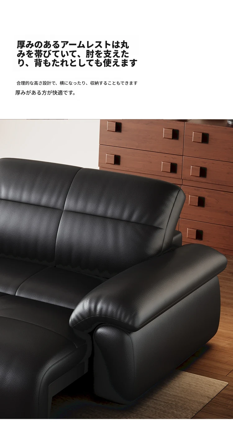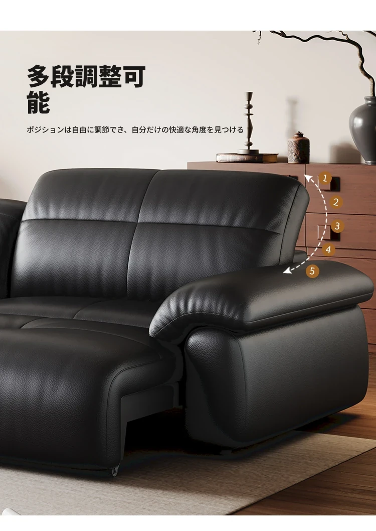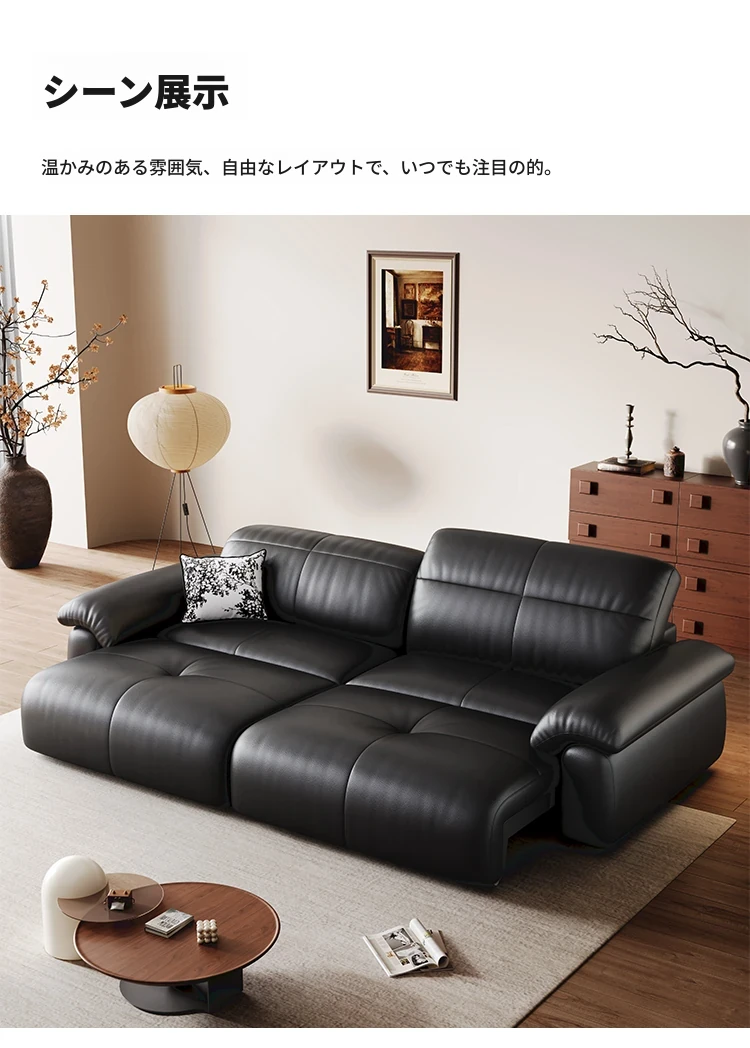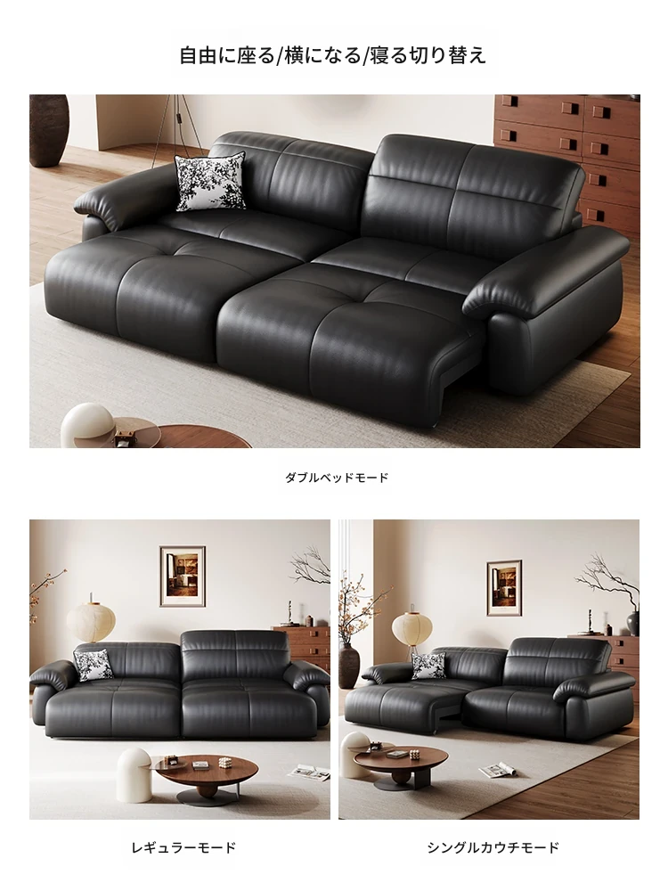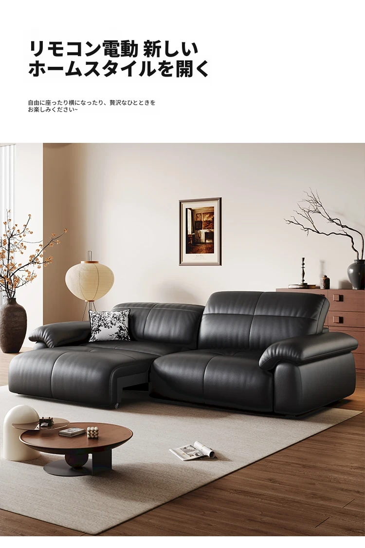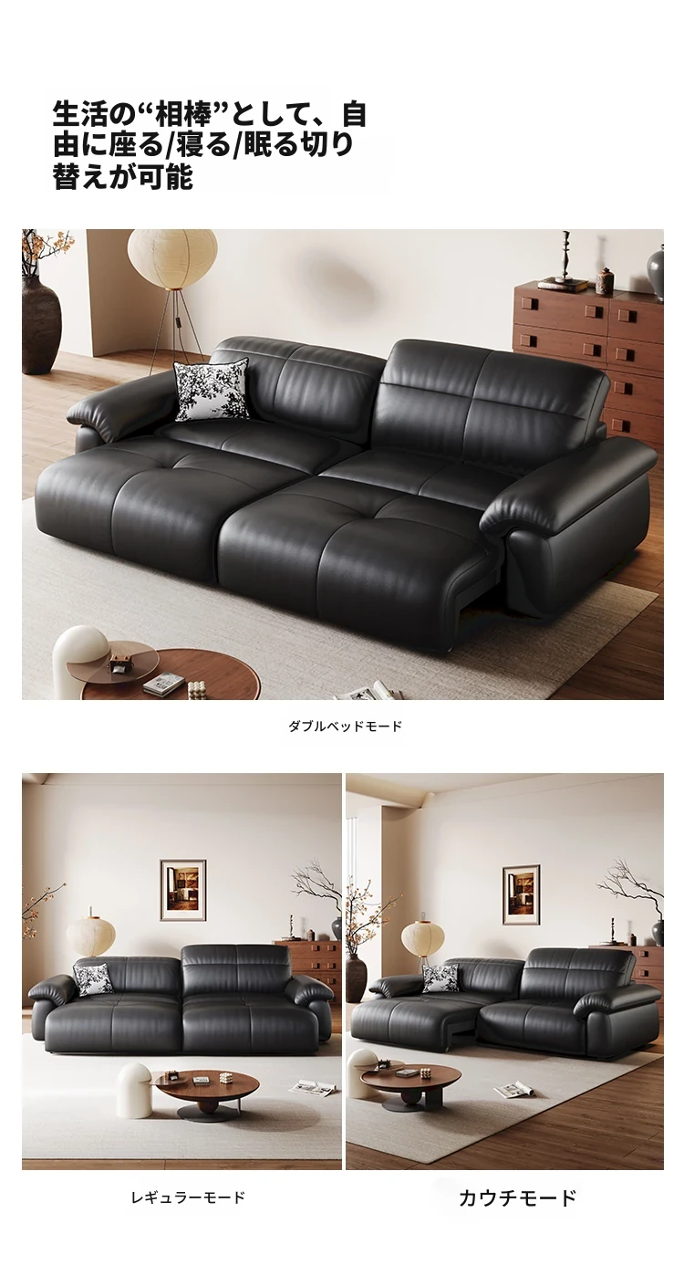 壁に寄せない電動ソファ - ミニマリストデザインの本革黒色ソファ。高品質なトップグレイン牛革使用。小さなリビングルームに最適な機能性伸縮ソファで、快適な空間を演出します!