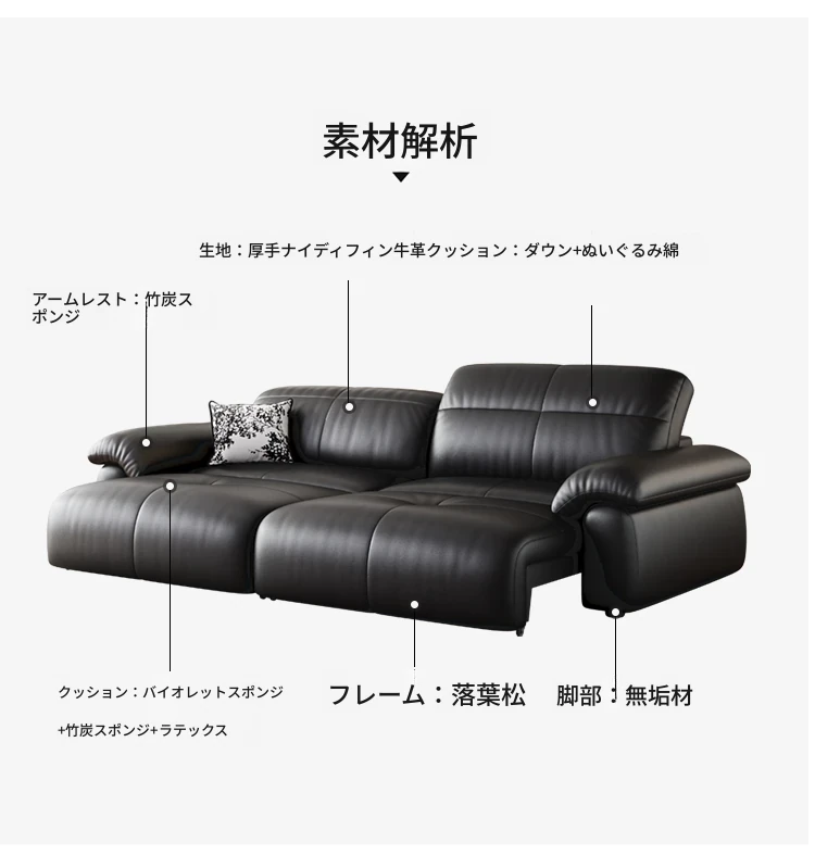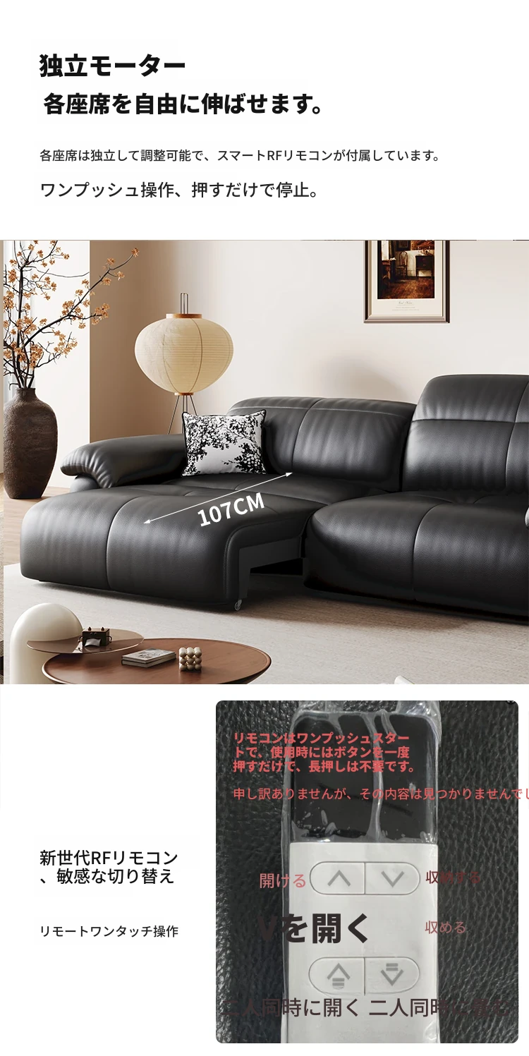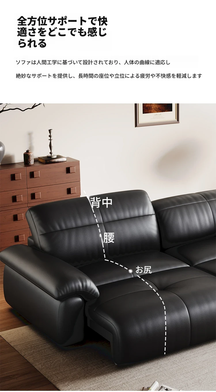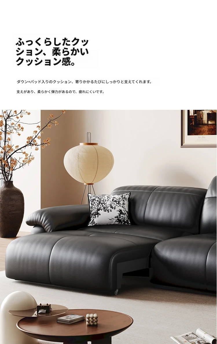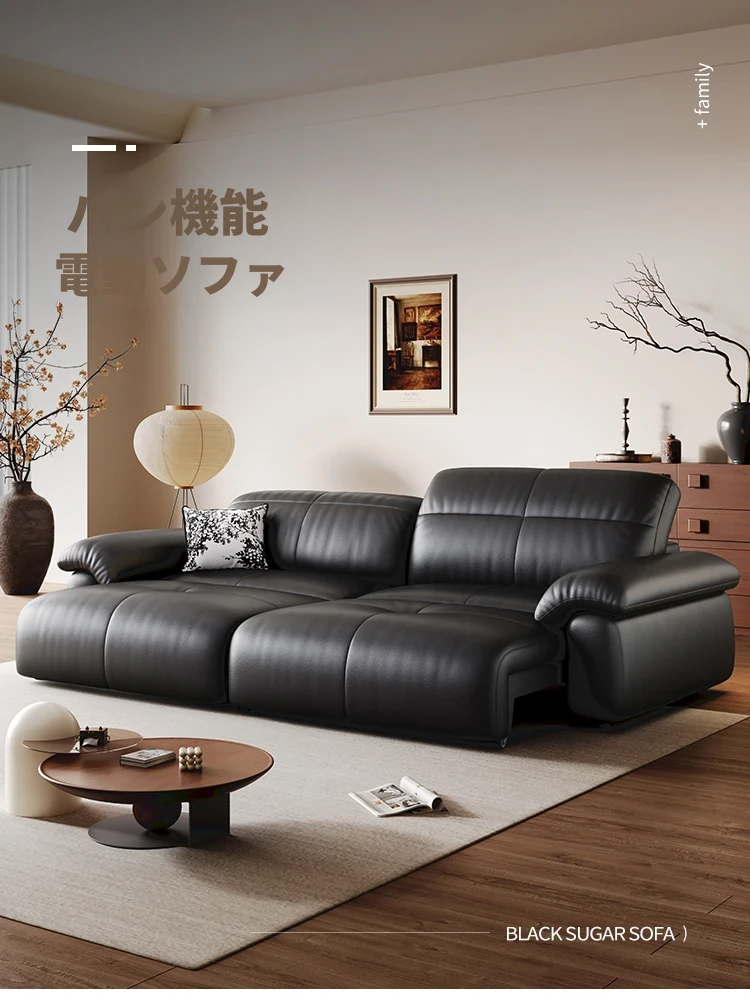 壁に寄せない電動ソファ - ミニマリストデザインの本革黒色ソファ。高品質なトップグレイン牛革使用。小さなリビングルームに最適な機能性伸縮ソファで、快適な空間を演出します!