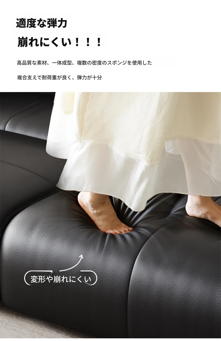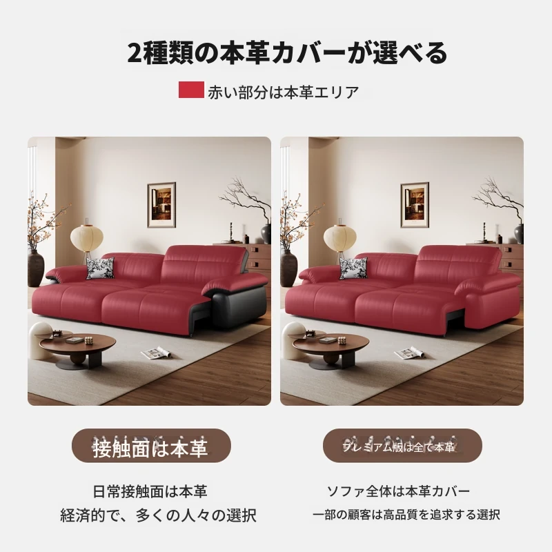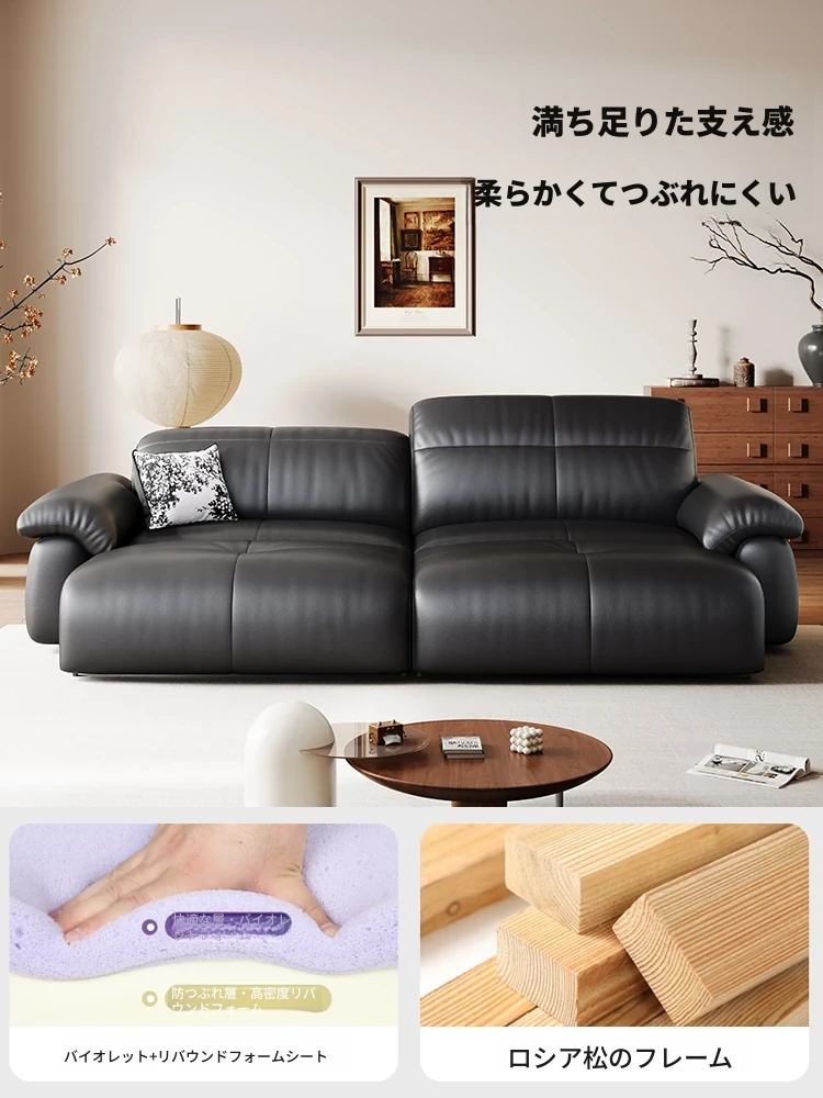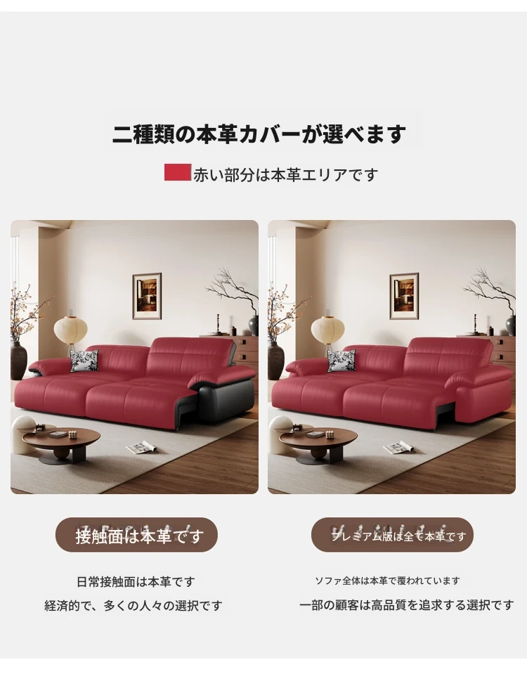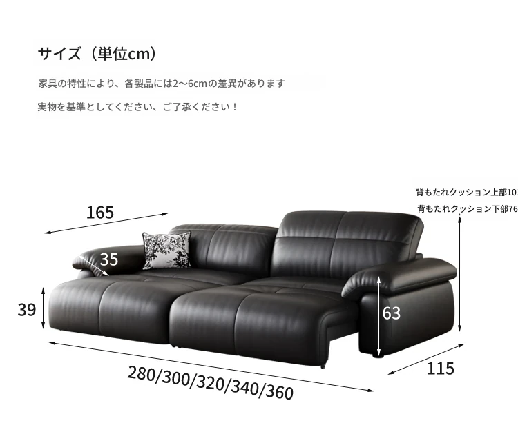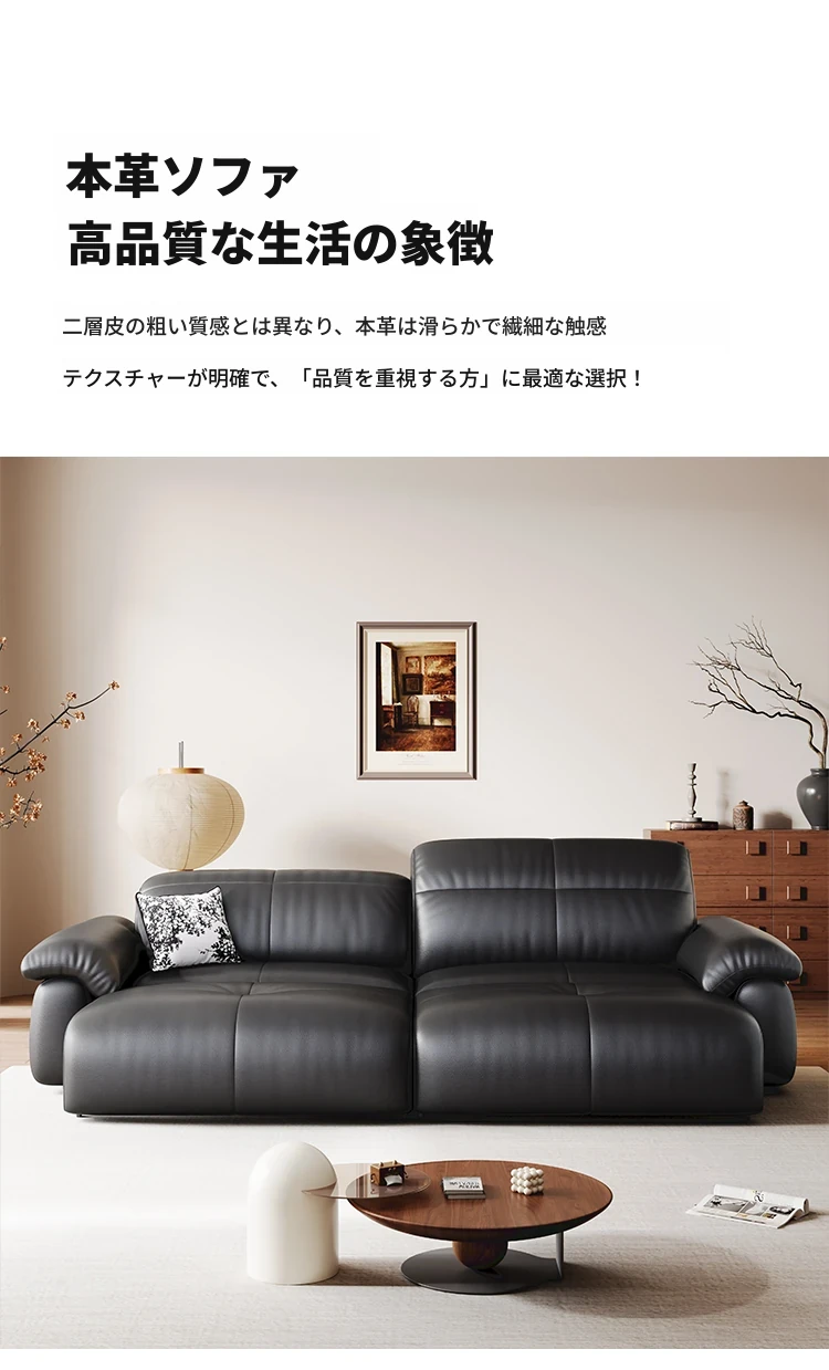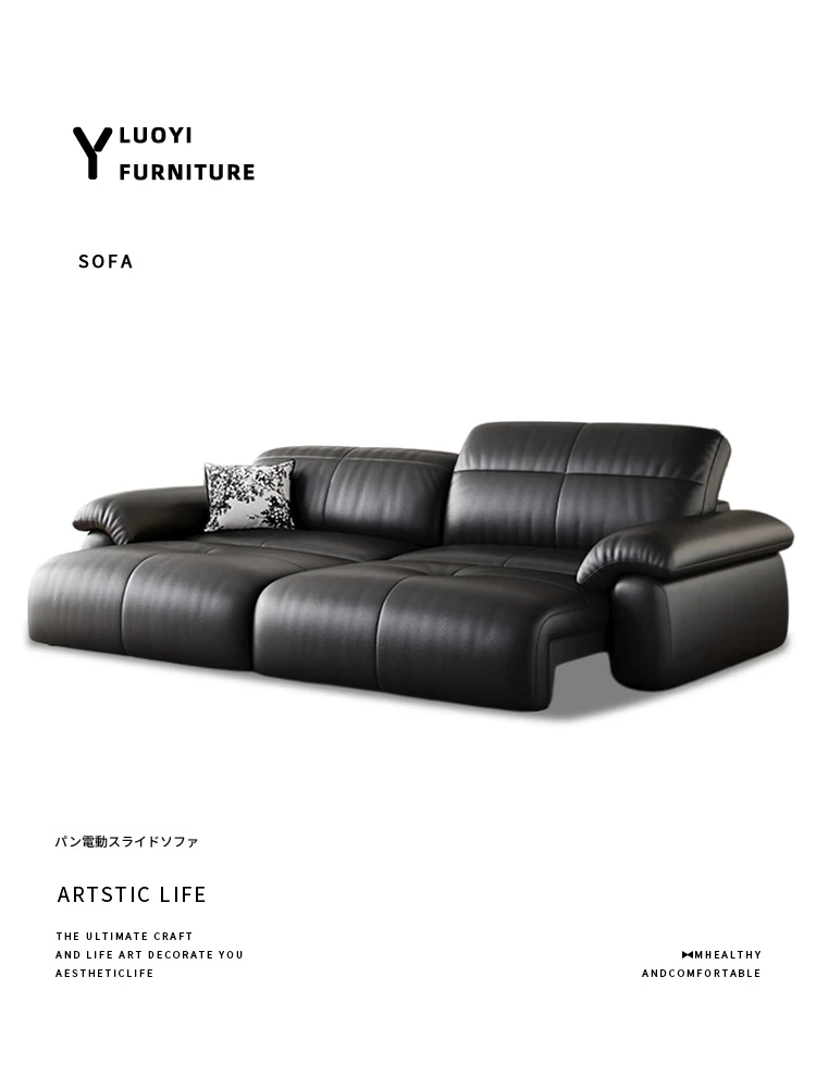 壁に寄せない電動ソファ - ミニマリストデザインの本革黒色ソファ。高品質なトップグレイン牛革使用。小さなリビングルームに最適な機能性伸縮ソファで、快適な空間を演出します!