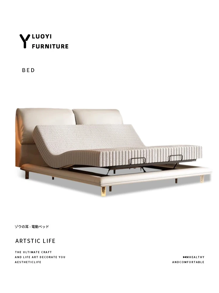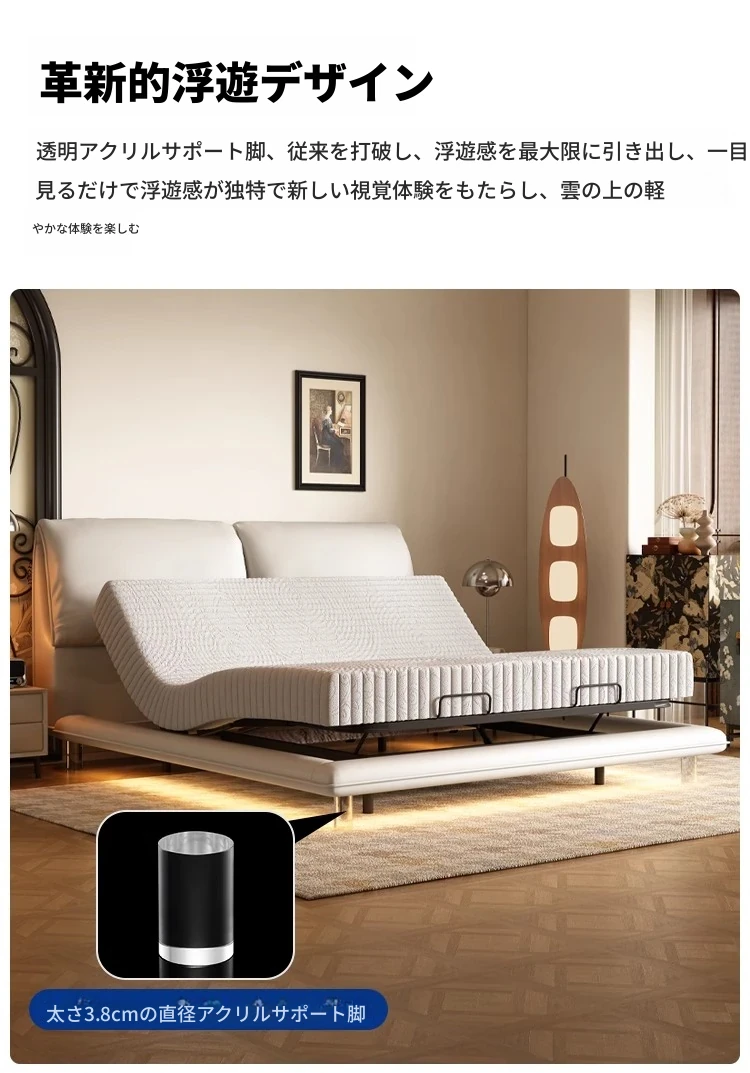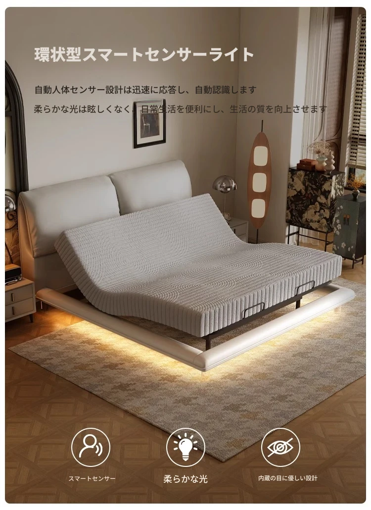 多機能電動ゾウ耳フローティングベッド|イタリアンミニマリズム真皮床|現代的シンプルデザイン|スマートリモコン昇降ベッド|快適さとスタイルを兼ね備えた贅沢な選択!