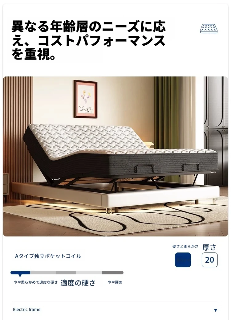 ヘッドボードなしベッド+電動ベッドフレーム+(やや柔らかい)独立スプリングマットレス