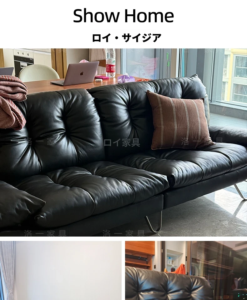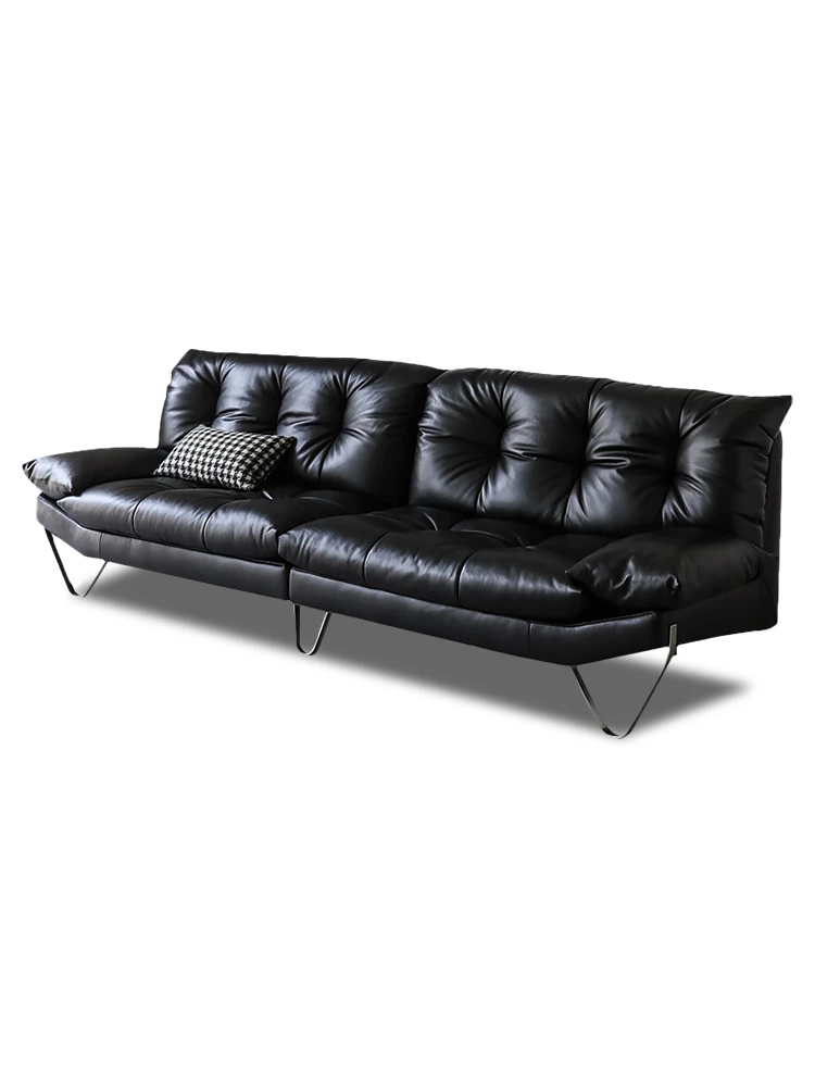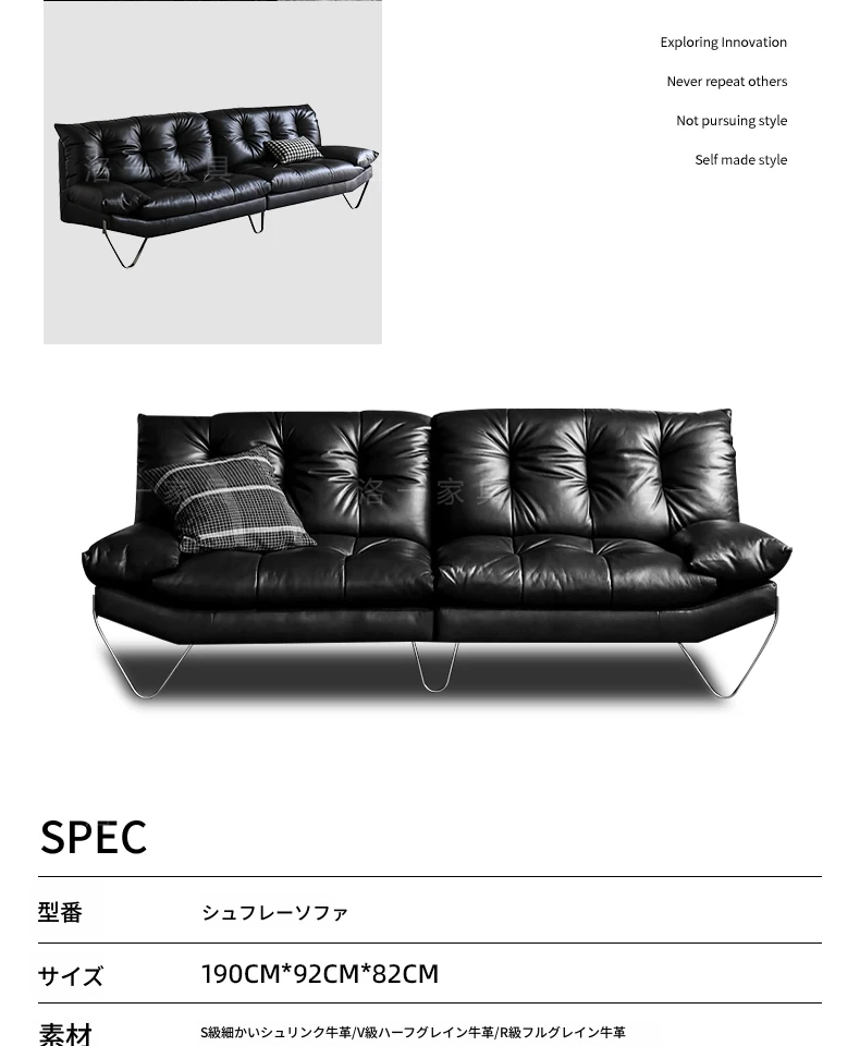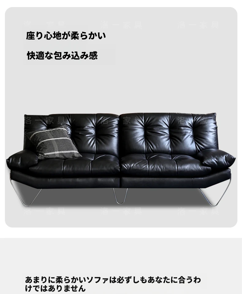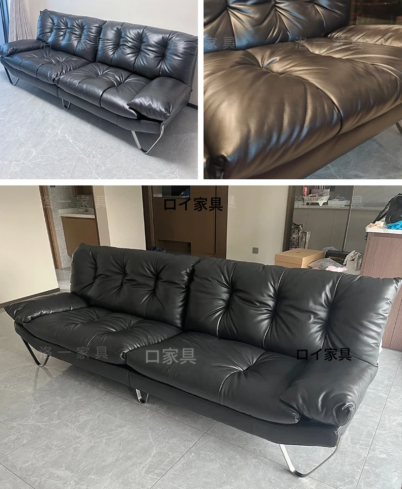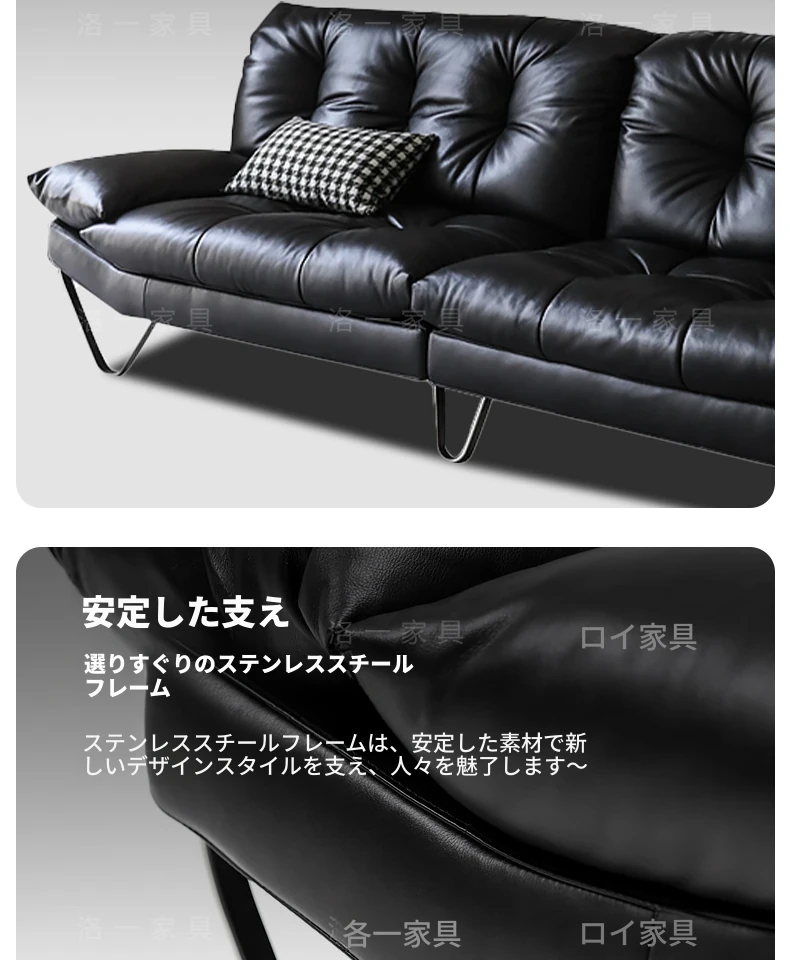 スフレバウハウスソファー - イタリアンミニマリズムの極み!高背もたれで浮遊感を楽しむ、ブラックトップグレインレザー製の真皮直線ソファ。贅沢な座り心地を体験して、あなたのリビングをスタイリッシュに演出!