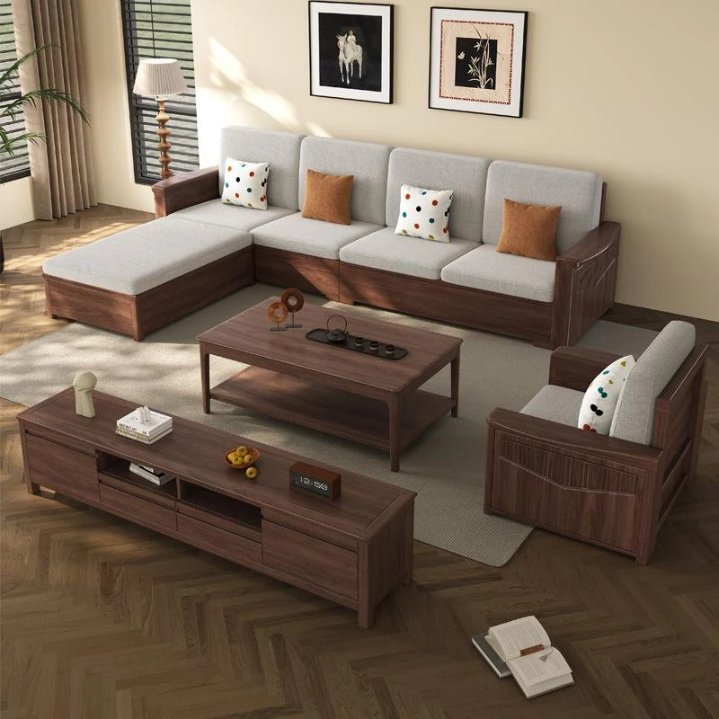 ウォールナット無垢材ソファー、現代的な新中式デザイン、20643モデル。小型3LDKに最適な直線型、4人掛けで家族や友人とのくつろぎの時間を演出します。高品質の材質で、長持ちする美しさをお楽しみください!